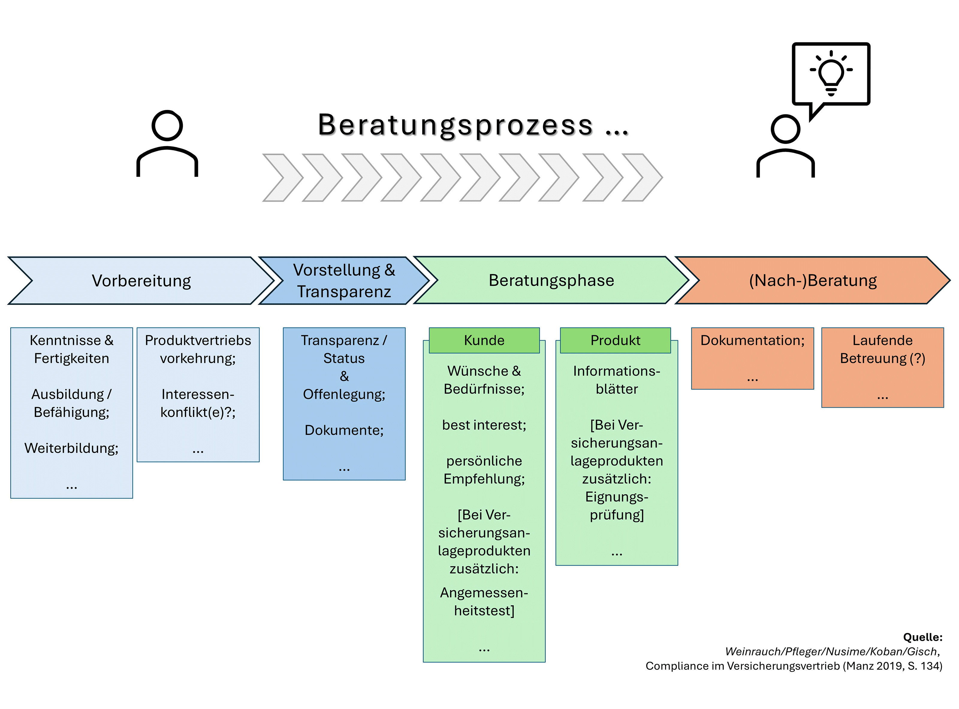 Die Grafik veranschaulicht die vier Phasen eines Beratungsprozesses und welche rechtlichen Aspekte und "Todo's" von Versicherungsmakler:innen beachtet werden müssen.