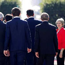 Die britische Premierministerin Theresa May steht isoliert und blickt zu den Staats- und Regierungschefs der Europäischen Union während des Familienfotos zum informellen EU-Gipfel in Salzburg.