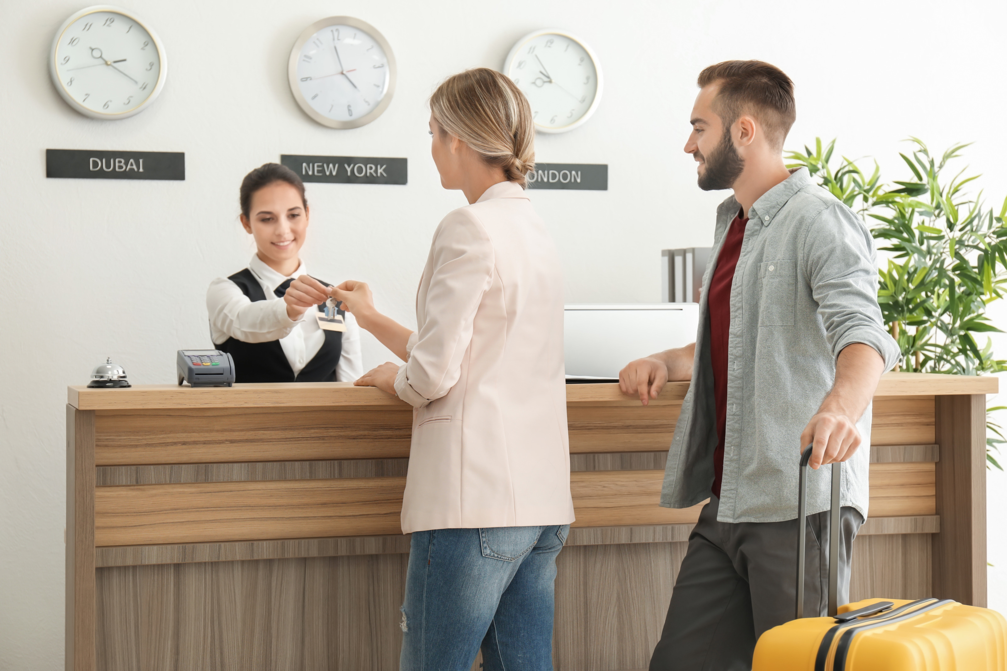 Personen mit Reisekoffer stehen vor einer Rezeption und erhalten einen Schlüssel von einer Person in Arbeitskleidung, eine Klingel sowie ein Kartenterminal stehen bereit, im Hintergrund sind Uhren mit verschiedenen Weltzeiten an der Wand montiert