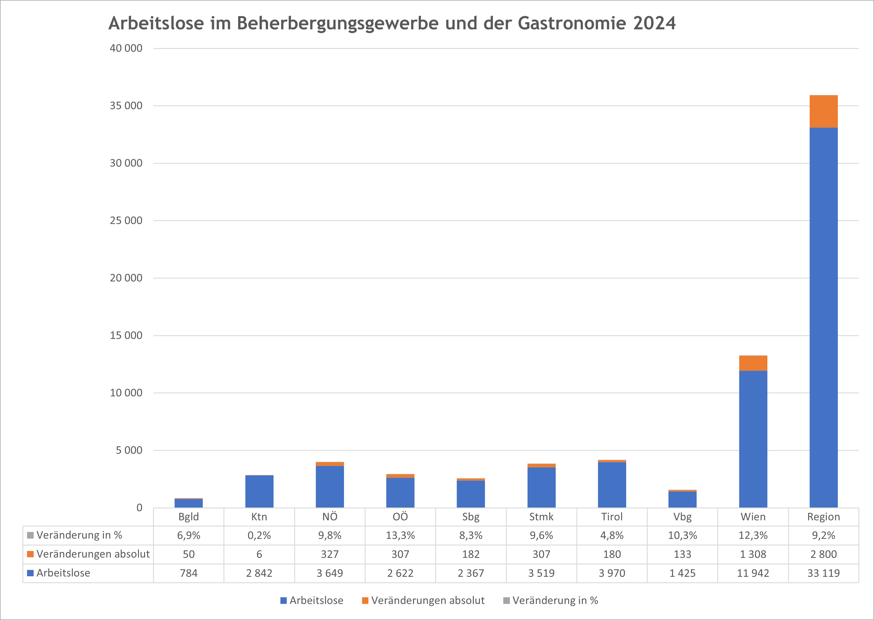 © Bundessparte Tourismus und Freizeitwirtschaft, WKÖ Entwicklung der Arbeitslosenzahl im Beherbergungsgewerbe und der Gastronomie nach Bundesländern 2024 (Quelle: AMS Österreich)