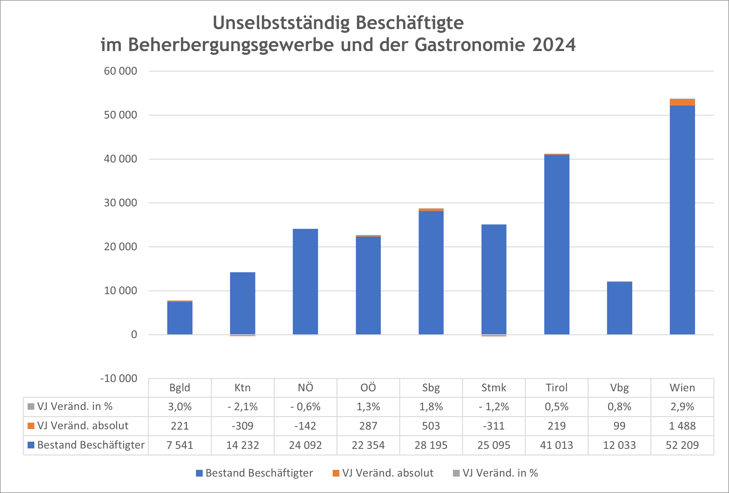 © Bundessparte Tourismus und Freizeitwirtschaft, WKÖ Entwicklung der unselbstständig Beschäftigten im Beherbergungsgewerbe und der Gastronomie nach Bundesländern 2024 (Quelle: AMS Österreich)