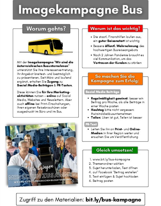 Mit der Imagekampagne "Wir sind die österreichischen Busunternehmen" unterstützt Sie Ihre Interessenvertretung, Ihr Angebot breitest- und bestmöglich zu präsentieren. Ab sofort und laufend ergänzt, erhalten Sie Zugang zu Social Media-Beiträgen und PR-Texten. Diese können Sie für Ihre Marketingaktivitäten nutzen - online auf Ihren Social Media-Kanälen, Ihrer Website und Ihren Newslettern. Aber auch offline, z.B. bei Einschaltungen in Printmedien, in eigenen Reisebroschüren, ausgedruckt im Büro oder im Bus verwenden.
