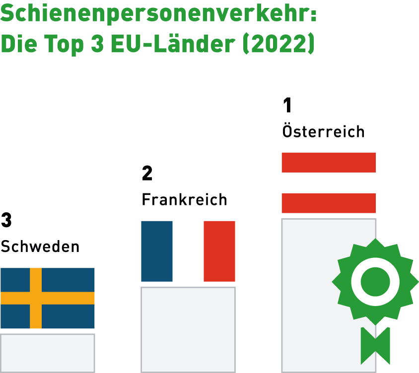 Die Österreicher legen mit 832 km pro Person mehr Bahnkilometer zurück als jede andere EU-Nation: Hinter Österreich liegen Frankreich, Schweden, Deutschland, die Niederlande und Dänemark. Alles in allem wurden 2021 in Österreich 8,5 Milliarden Personenkilometer gefahren. Das ist ein Plus von 15 Prozent im Vergleich zum ersten Krisenjahr 2020.