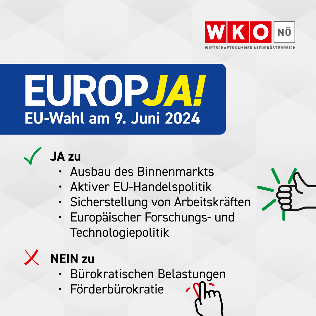 Kurz gesagt: JA zu Europa – NEIN zur Bürokratie! Mehr dazu finden Sie auch in unserem aktuellen WKNÖ-Positionspapier "Unser Standpunkt" und in der WKNÖ-Presseinformation vom 29.5. 2024!