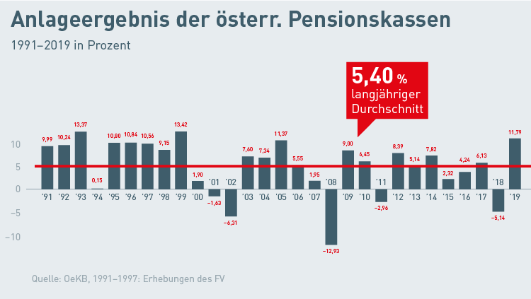 Im Jahr 2019 haben die Pensionskassen ein Veranlagungs-Ergebnis von plus 11,79 Prozent erwirtschaftet. Andreas Zakostelsky, Obmann des Fachverbandes der Pensionskassen in der Wirtschaftskammer Österreich, erläutert: "Pensionskassen verfolgen ausschließlich eine langfristige Strategie. Dieses Ergebnis beweist wieder, dass unser System nachhaltig Ergebnisse bringt, die allen Vergleichen standhalten!".