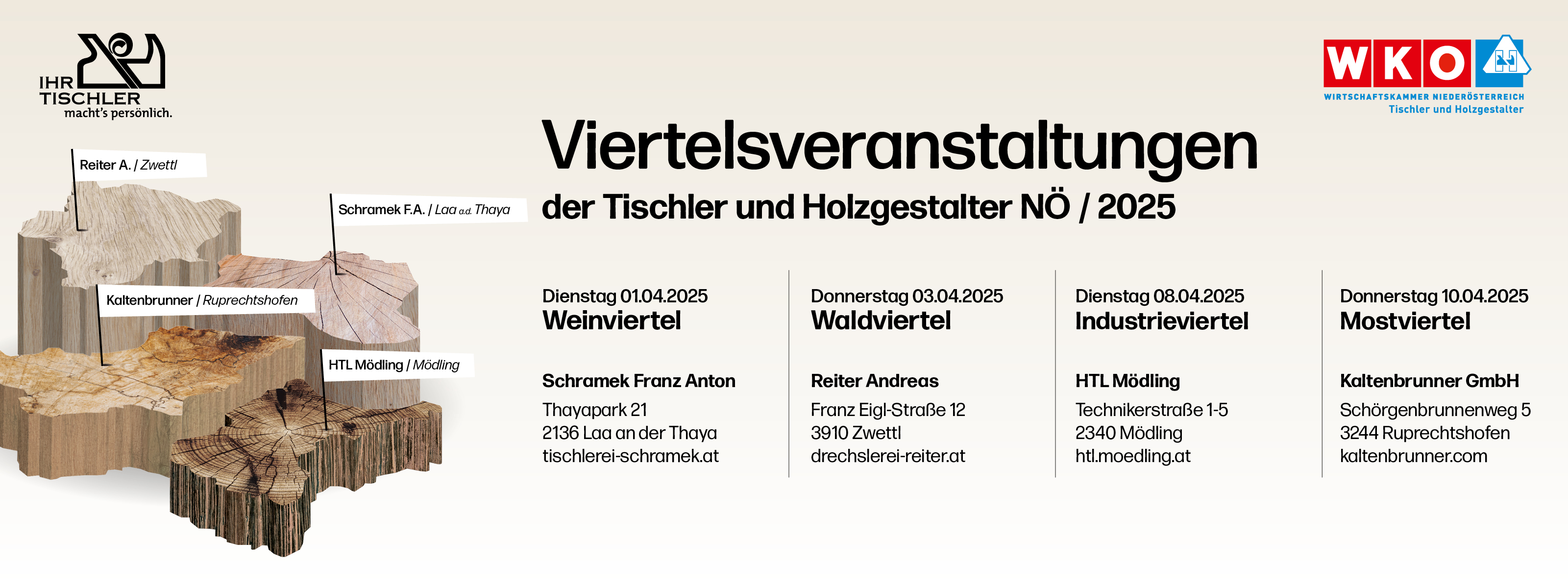 Es ist wieder so weit. Die Landesinnung Niederösterreich lädt zu den Viertelveranstaltungen. Ein spannendes Programm, das sich haarscharf an den brennenden Fragen des Tischlerhandwerks orientiert wartet auf Euch. Zudem ist der ganze Vorstand vor Ort und beantwortet Eure individuellen Anliegen.