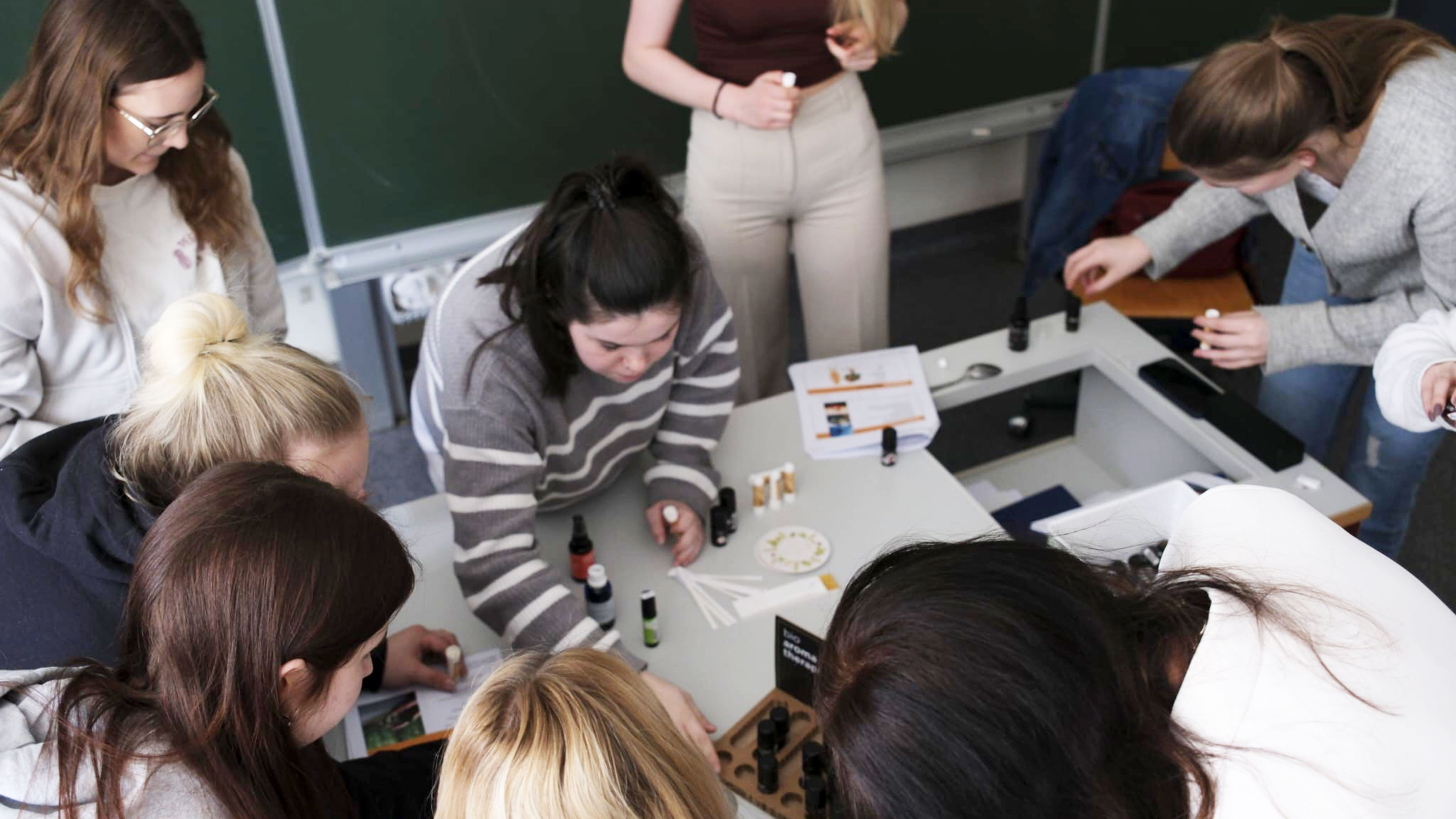 Am Workshop nahm die 3. Klasse der Drogistenlehrlinge statt und erfuhr somit allerlei über Aromakunde und Aromaöl, Düfte in unserer Gesellschaft, Pflanzliche Öle & Hydrolate, Etikettierung, Das FruFloRa®-Prinzip und Vorsichtsgebote, Stärkung des Immunsystems sowie Stressbewältigung & Stimmungsaufhellung.