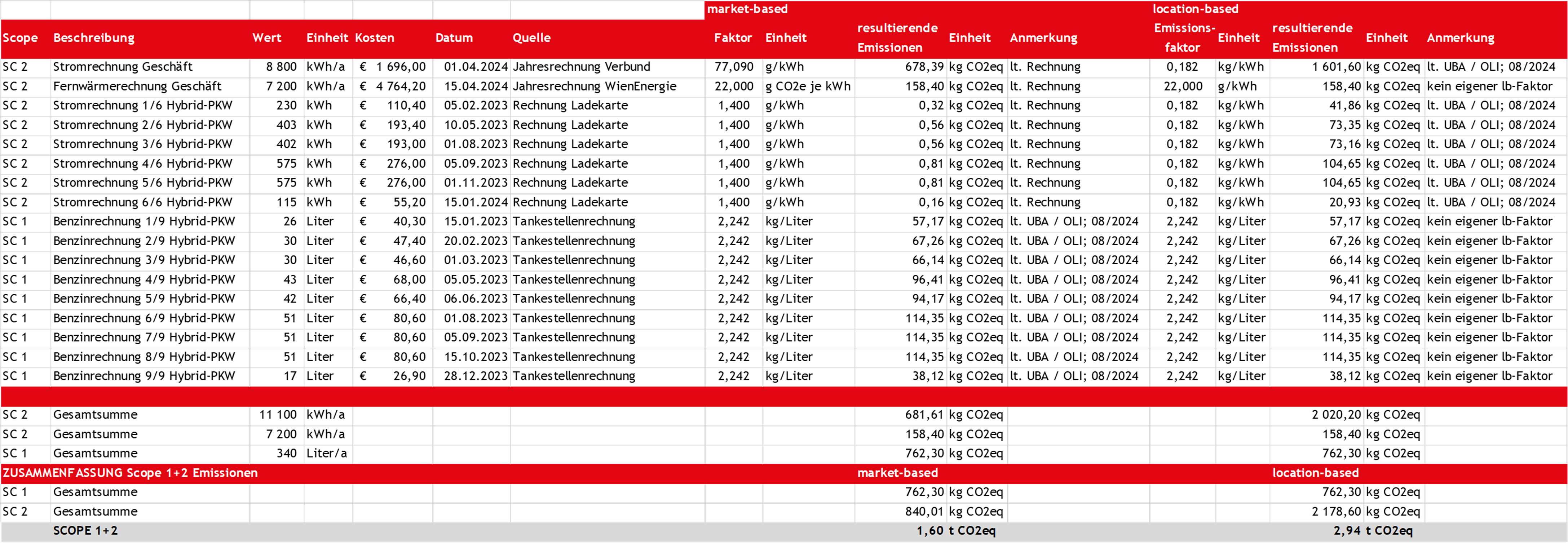 Liegen Ihnen genaue Tarifangaben vor und Sie können nach GHG-Protocol vorgehen, so benötigt das Ganze eine Unterscheidung in market- und location-based in Scope 2 und somit 2 Angaben (zur besseren Lesbarkeit wurden die Spalten "Zuordnung" und "Bezugszeitraum" ausgeblendet):