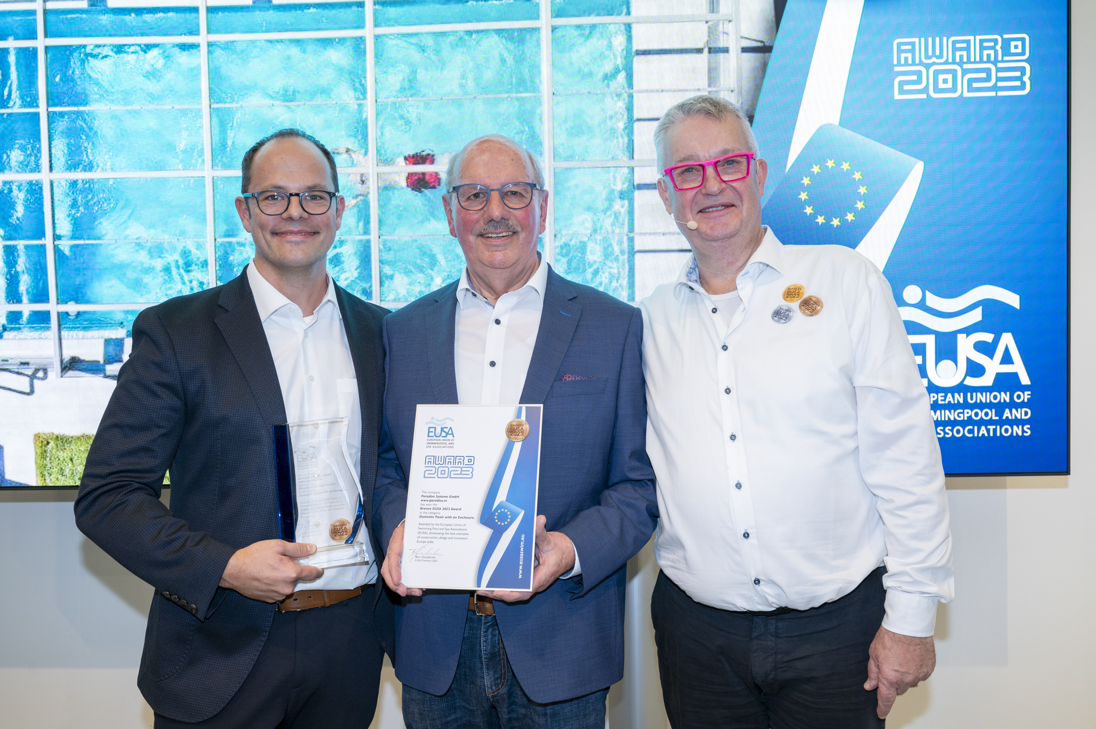 Die Siegerehrung wurde von EUSA-Präsident Bert Granderath moderiert. Zur stimmungsvollen Gala, die im Kölner Messegelände stattfand, hatten sich über 180 Gäste angemeldet, darunter auch Vertreter des ÖVS. Die Auszeichnung in Gold nahm Bernhard Weissenecker, Geschäftsleiter der Polytherm GmbH, entgegen. Das oberösterreichische Familienunternehmen arbeitet bereits seit mehr als 30 Jahren in der Branche Schwimmbadtechnik. Über Bronze freuten sich Vater Karlheinz Fels und Sohn Carsten Fels, Geschäftsführer der Paradiso Systeme GmbH. Das innovative Unternehmen mit Hauptsitz im deutschen Neuried setzt seit 1993 neue Maßstäbe im Bereich Poolüberdeckungen.