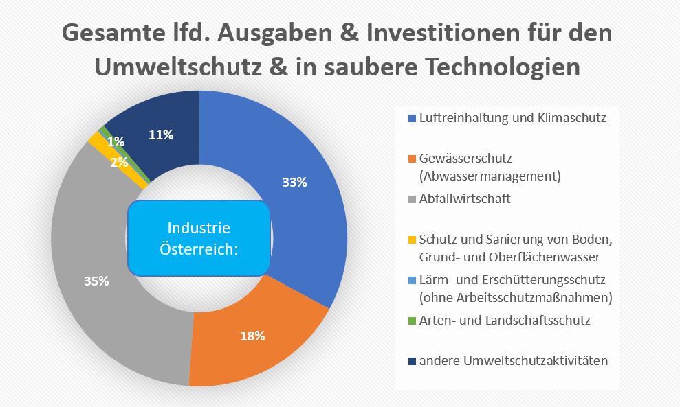 Rund drei Viertel der gesamten Umweltschutzausgaben sind im Jahr 2021 laufende Ausgaben, ein Viertel sind Investitionen, die entweder in end-of-pipe-Einrichtungen oder in integrierte Technologien fließen. Bei der Frage danach, in welche Bereiche diese Mittel fließen, geht ein breites Feld auf. Werden die laufenden Ausgaben und die Investitionen aufsummiert, so fließen die Mittel insbesondere in die Abfallwirtschaft (35 %) bzw. die Luftreinhaltung und den Klimaschutz (33 %) sowie den Gewässerschutz (18 %).