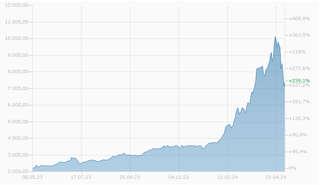 Grafik: Preise für Kakao hatten sich innerhalb eines Jahres mehr als verdreifacht und sind aktuell immer noch rund doppelt so hoch wie zu Jahresbeginn (Preis in GBP/Tonne; 6.5.2024)