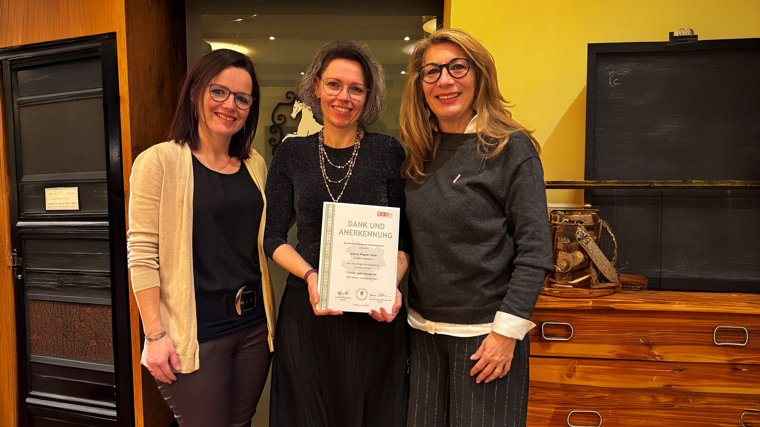 Im Rahmen einer Feier ehrte Bezirksstellenobfrau Silvia Rupp Mitarbeiterin Andrea Wagner-Oiser zum 10-jährigen Dienstjubiläum bei „haargenial“. Rupp bedankte sich bei ihr für die Loyalität zum Unternehmen und überreichte im Namen der Wirtschaftskammer eine Urkunde. „Langjährige Mitarbeitende sind für ein Unternehmen nicht nur von großer Wichtigkeit, sondern ein Zeugnis von gutem Arbeitsklima. Es ist mir immer eine Ehre zu Dienstjubiläen zu gratulieren“, berichtet Bezirksstellenobfrau und wünscht Andrea Wagner-Oiser alles Gute.