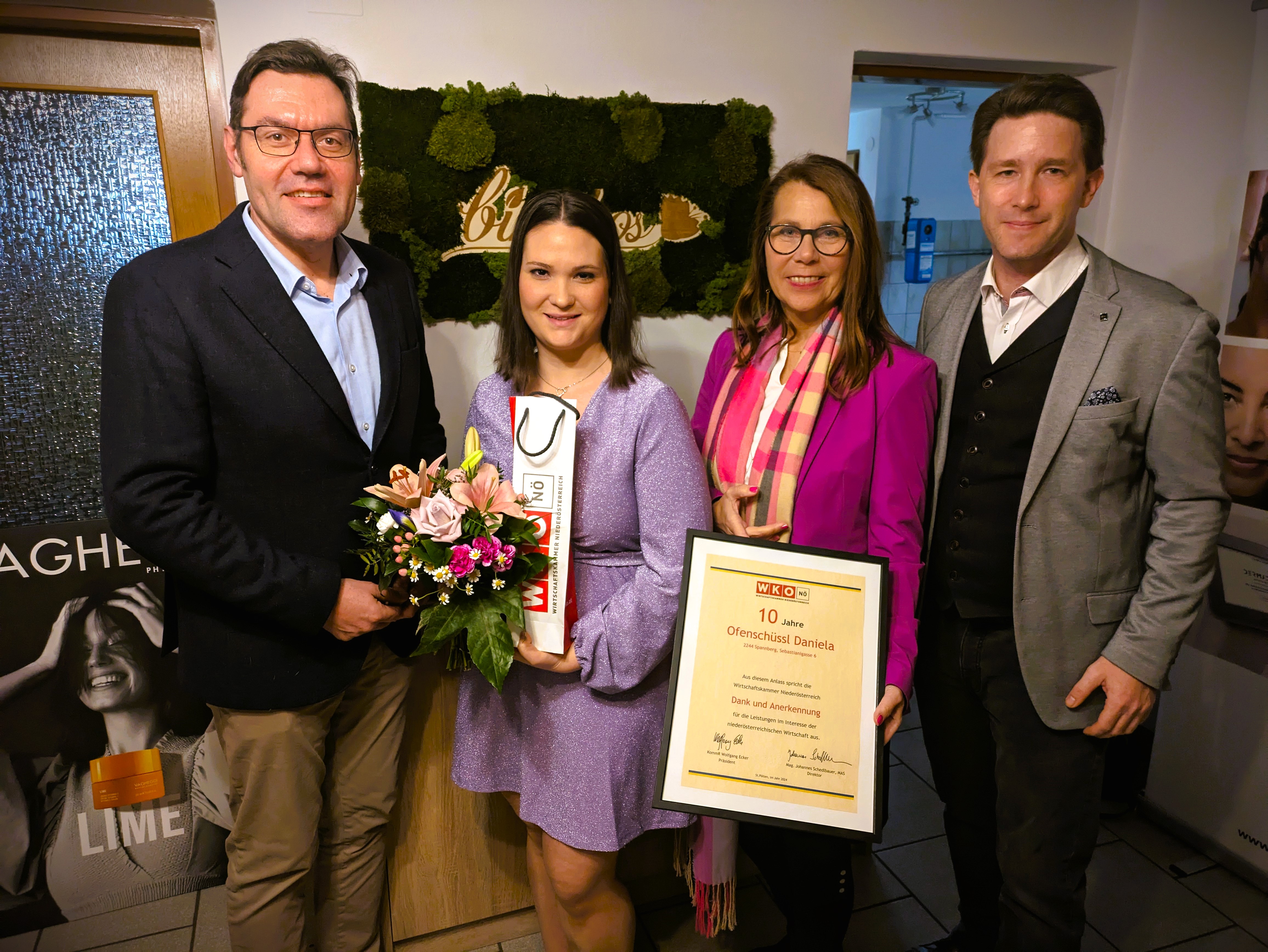 Bezirksstellenobmann Andreas Hager, Bezirksstellenleiter Philipp Teufl und Bezirksvertreterin Frau in der Wirtschaft Andrea Prenner gratulierten der Jubilarin für den unermüdlichen Einsatz.