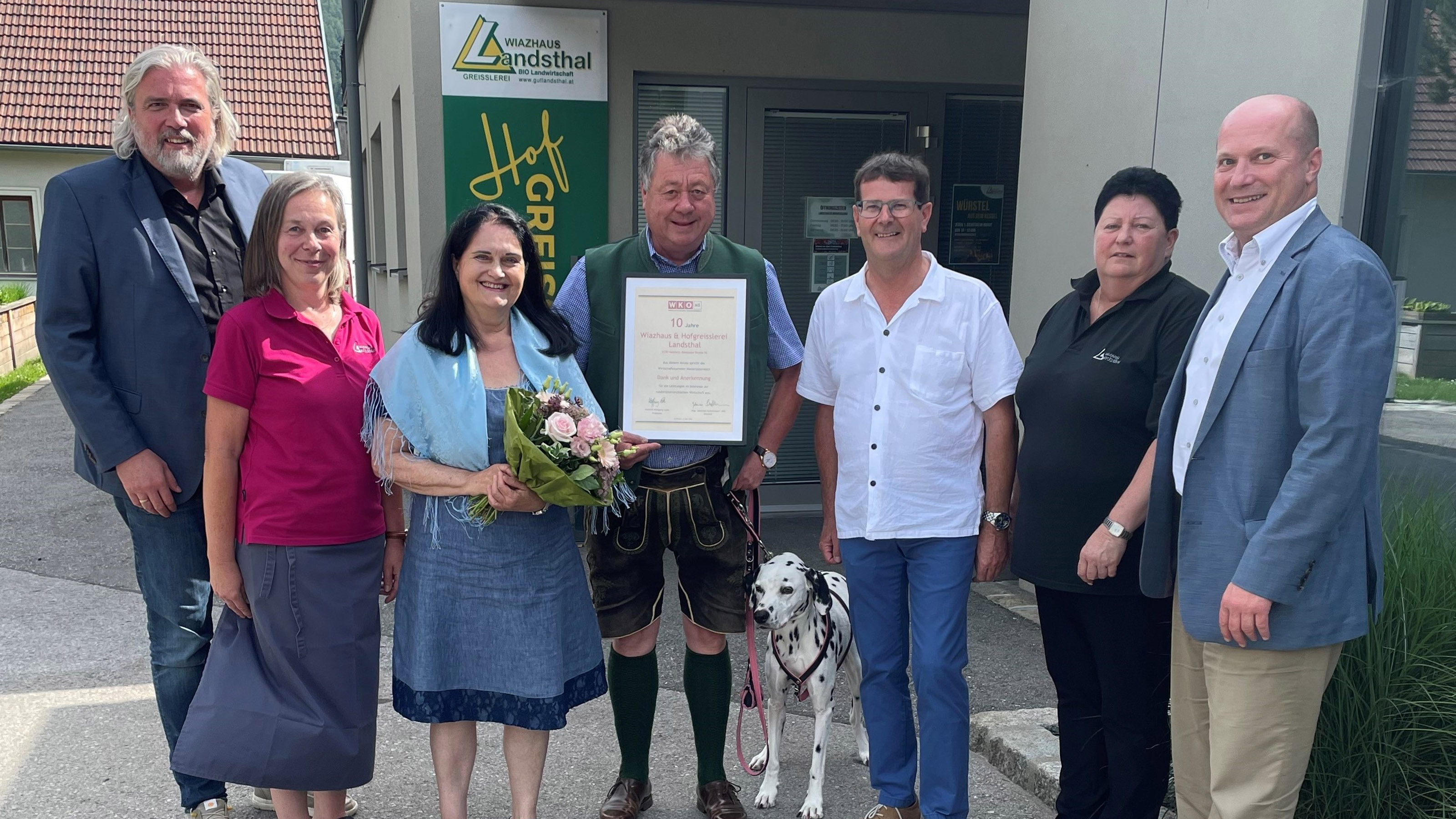WKNÖ-Bezirksstellenobmann Markus Leopold und WKNÖ-Bezirksstellenleiter Georg Lintner gratulierten, gemeinsam mit Bürgermeister Albert Pitterle, Martina und Johann Zöchling zum 10-jährigen Jubiläum Wiazhaus und Hofgreisslerei Landsthal. Johann Zöchling erzählte, dass nunmehr seit 20 Jahren das Gut Landsthal besteht und bedankte sich bei dieser Gelegenheit bei seinen Mitarbeiterinnen Natascha Gruber und Karin Haslinger für deren Unterstützung.