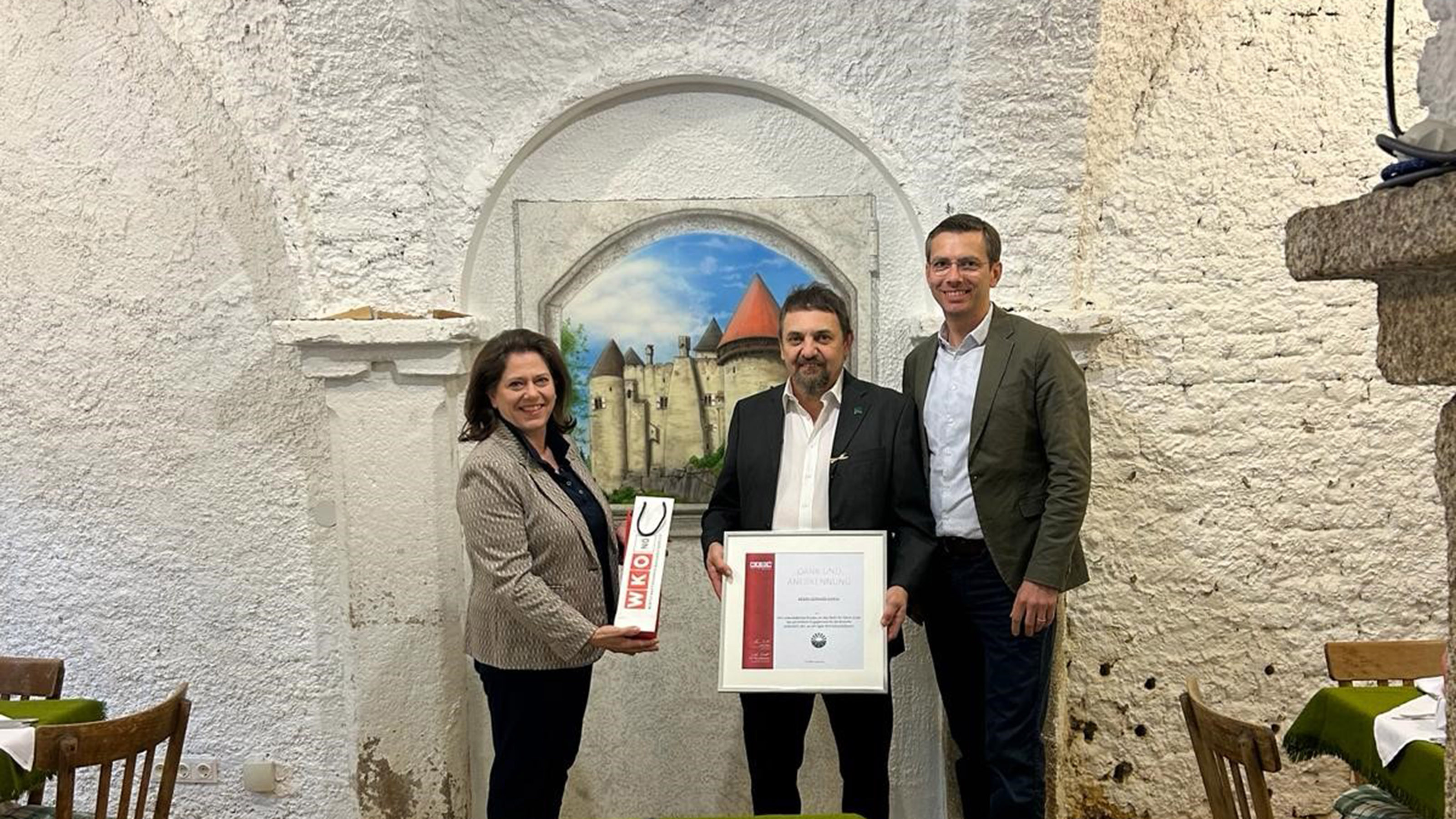 Unter den zahlreichen Gratulanten aus Wirtschaft, Politik, Behörden und Wegbegleitern waren auch Bezirksstellenobfrau Doris Schreiber und Spartengeschäftsführer der Sparte Tourismus und Freizeitwirtschaft Walter Schmalwieser die Gerhard Dangl herzlichst gratulierten, eine Urkunde und eine Flasche Sekt überreichten und ihm, seiner Lebensgefährtin und dem gesamten Team noch viele erfolgreiche Jahre wünschten.