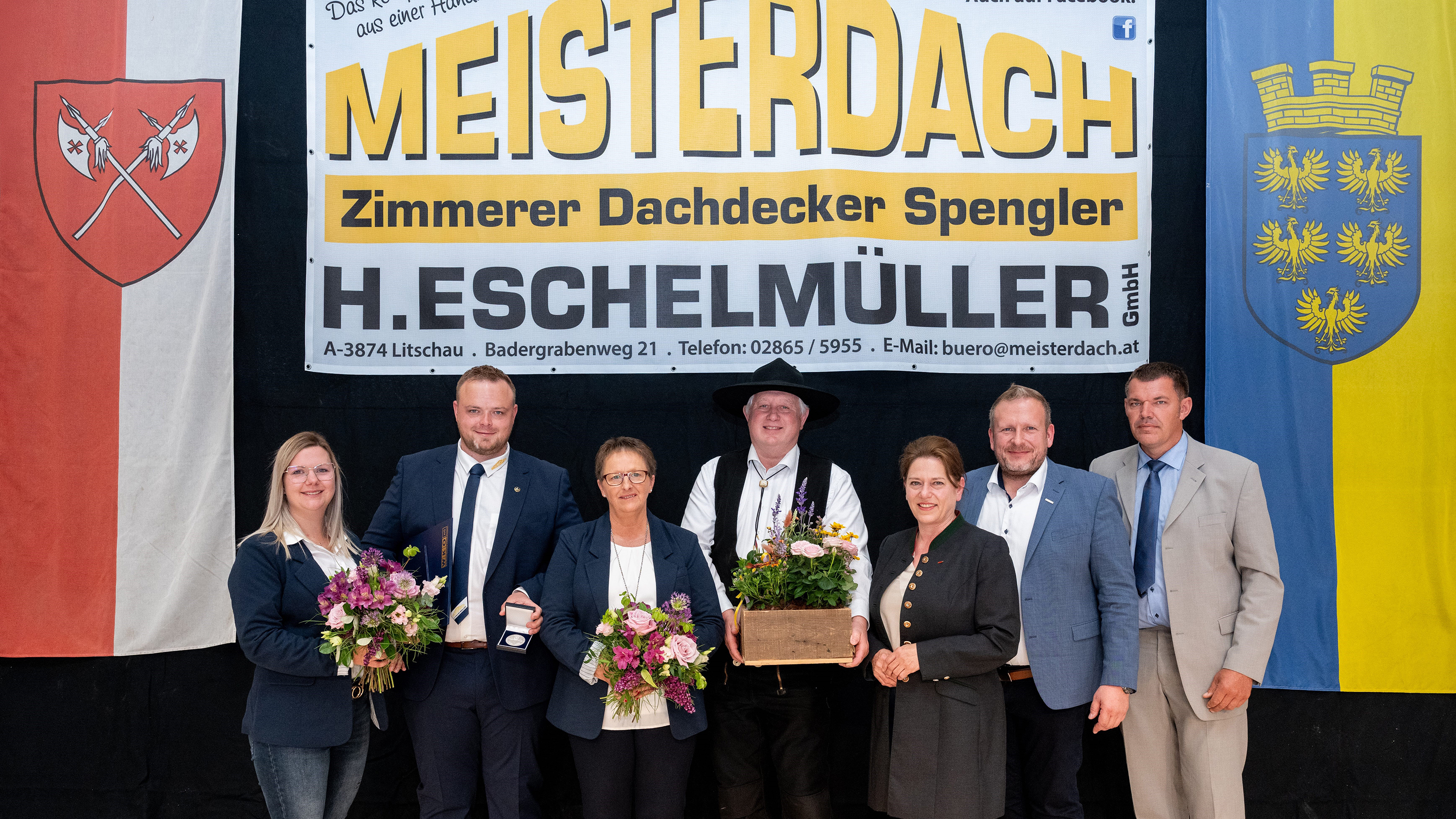 Unter den zahlreichen Gratulanten waren auch Spartenobmann Jochen Flicker (Gewerbe und Handwerk), Landesinnungsmeister KommR Wolfgang Huber (Holzbau), Landesinnungsmeister-Stv. Mst Helmuth Degeorgi (Spengler), Bezirksstellenobfrau KommR Doris Schreiber und Bezirksstellenleiter Andreas Krenn. Sie alle gratulierten der Familie Eschelmüller zu dem hart erarbeiteten Erfolg und wünschten ihnen und ihrer gesamten Belegschaft viel Erfolg für die Zukunft.