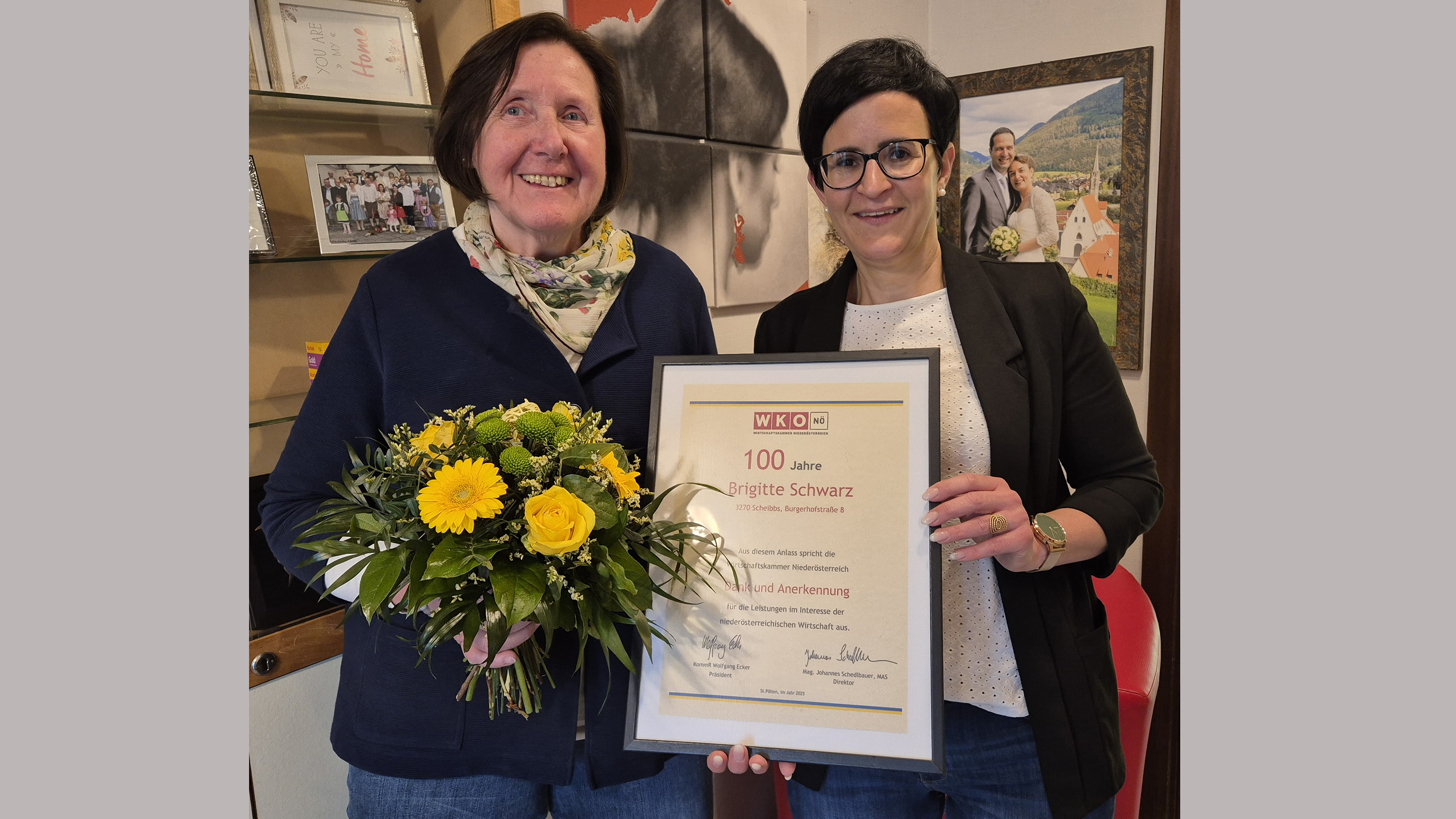 Aus Anlass des 100-jährigen Jubiläums besuchten Bezirksstellenobfrau Silvia Teufl und Bezirksstellenleiter Augustin Reichenvater Frau Schwarz in ihrem Fotostudio und überreichten ihr Blumen und eine Jubiläumsurkunde der Wirtschaftskammer Niederösterreich.