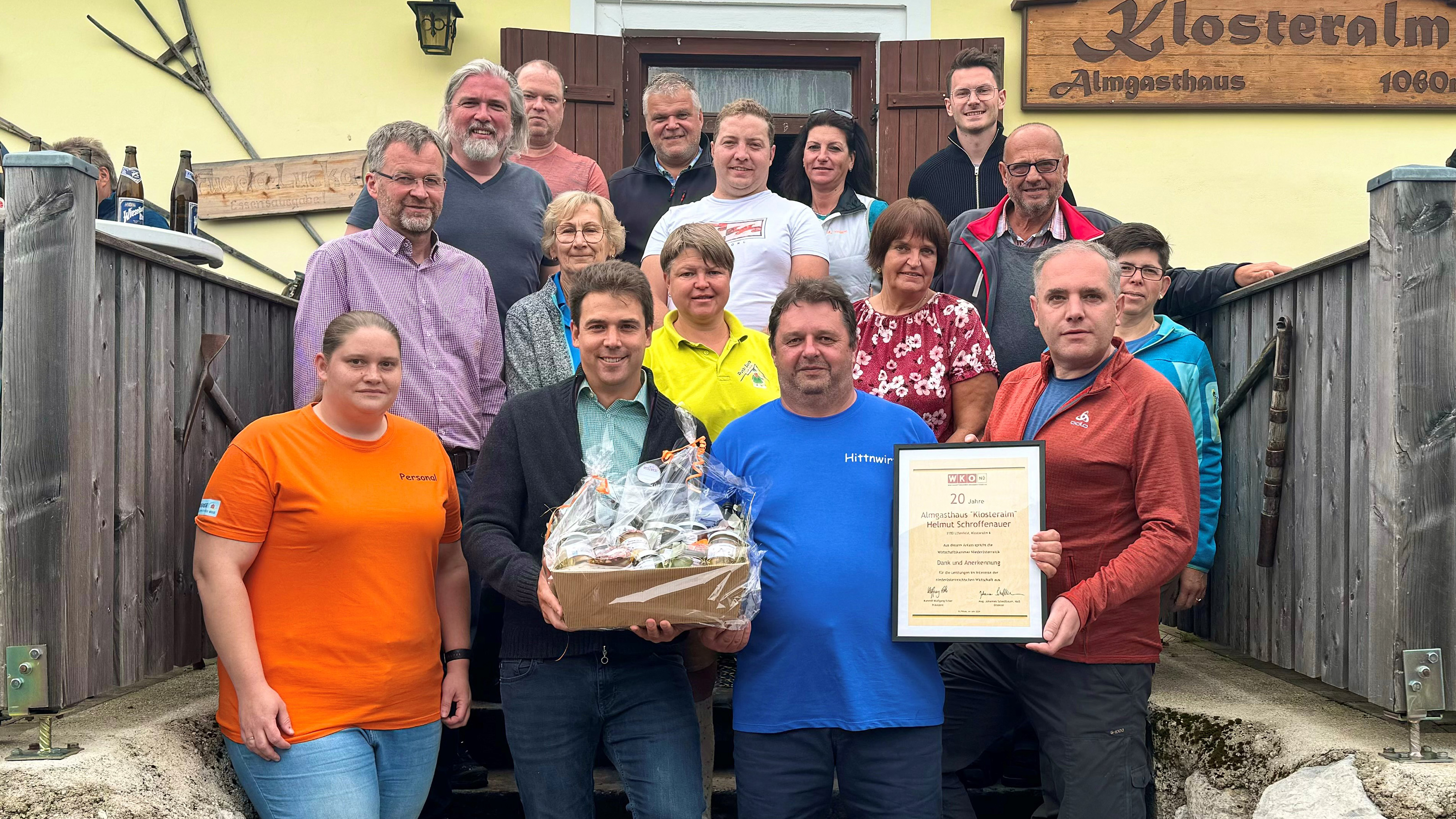 WKNÖ-Bezirksstellenobmann Markus Leopold (3.v.l.) gratulierte mit einer Urkunde Helmut ,Schroffi' Schroffenauer zum 20 Jahre-Jubiläum als Hüttenwirt des Almgasthauses „Klosteralm“, ebenso Bürgermeister Manuel Aichberger (6.v.l.), Vizebürgermeister Christian Buxhofer (2.v.r.), Forstdirektor Klaus Kratzer (2.v.l.) sowie alle aktiven und ehemaligen Hüttenwirte.
