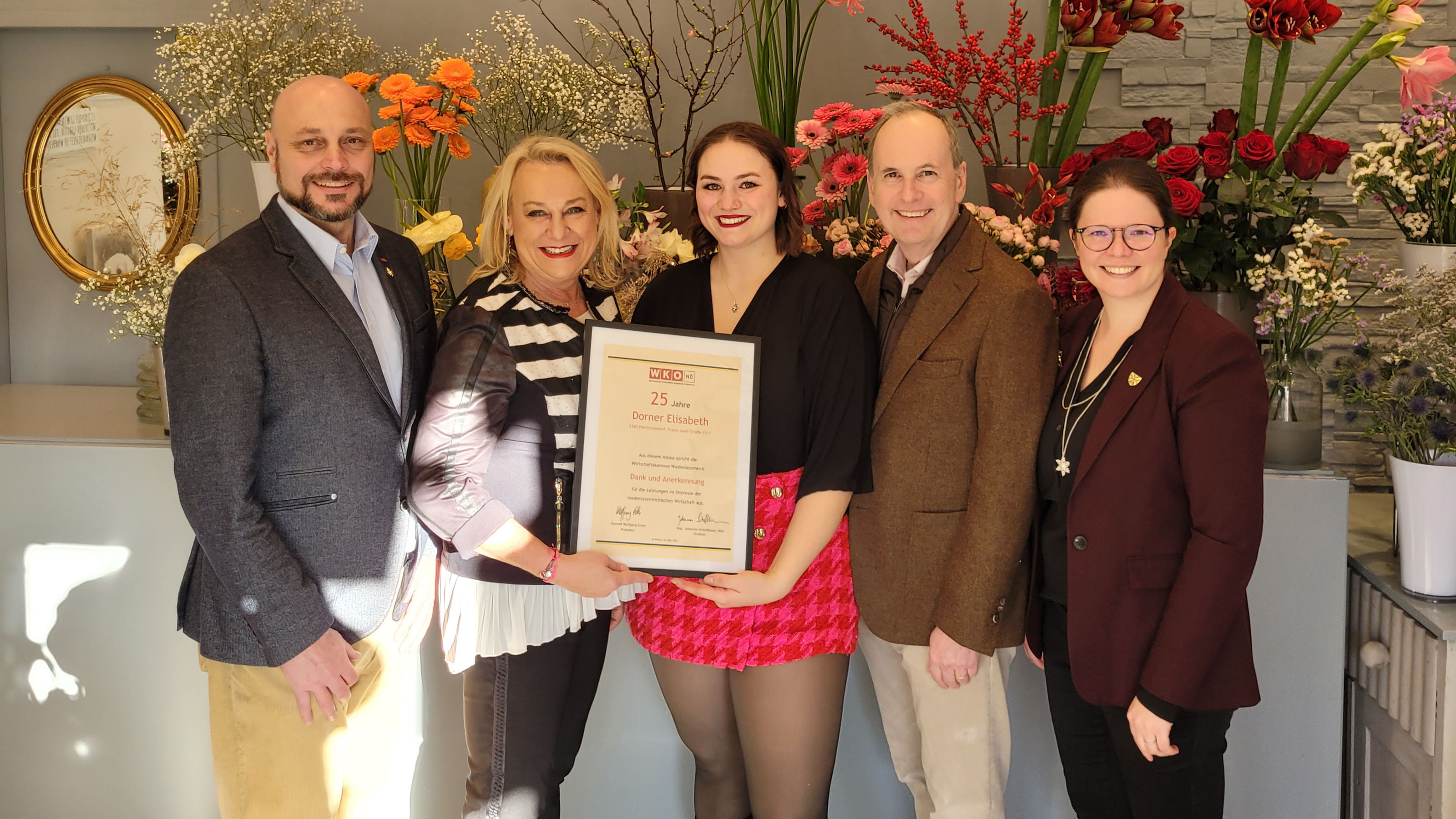 „Blumen - die schönste Sprache der Welt“, lautet das Motto von Power-Unternehmerin Elisabeth Dorner, ihres Zeichens auch Bezirksvorsitzende von Frau in der Wirtschaft Mödling, und Floristin mit Leib und Seele. Eine Abordnung der Wirtschaftskammer Niederösterreich – darunter WKNÖ-Vizepräsident Erich Moser, WK-Mödling Bezirksstellenobmann Martin Fürndraht und Leiterin Andrea Lautermüller – würdigte das 25-jährige Firmenjubiläum durch Überreichung einer Urkunde. Die gelernte Floristin eröffnete 1999 das heutige Geschäft in der Franz-Josef-Straße in Perchtoldsdorf. Mittlerweile ist auch schon die nächste Generation mit Tochter Caroline Dorner – ausgebildete Meisterfloristin – im Betrieb tätig. „Wir bedanken uns für das tatkräftige Engagement für die Branche der Floristen sowie für Unternehmerinnen im Bezirk“, so Erich Moser und Martin Fürndraht.