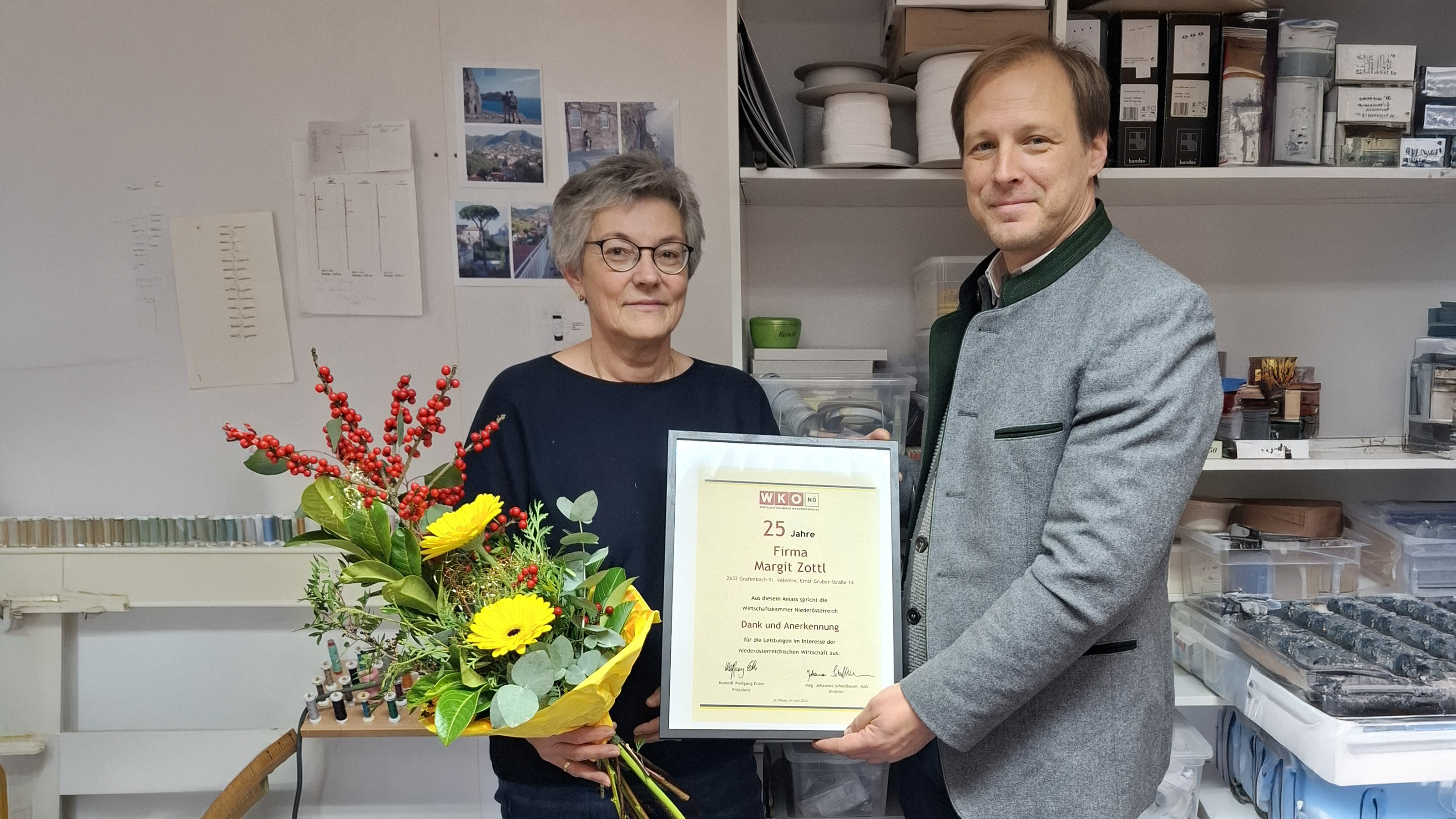 Margit Zottl, Damenkleidermacherin aus Grafenbach, wagte im Jahr 1999 den Schritt in die Selbständigkeit und feierte nun ihr 25-jähriges Firmenjubiläum. Zu diesem freudigen Anlass überreichte Bezirksstellenleiter Bernhard Dissauer-Stanka eine Dankesurkunde und wünschte der Unternehmerin weiterhin viel Erfolg.