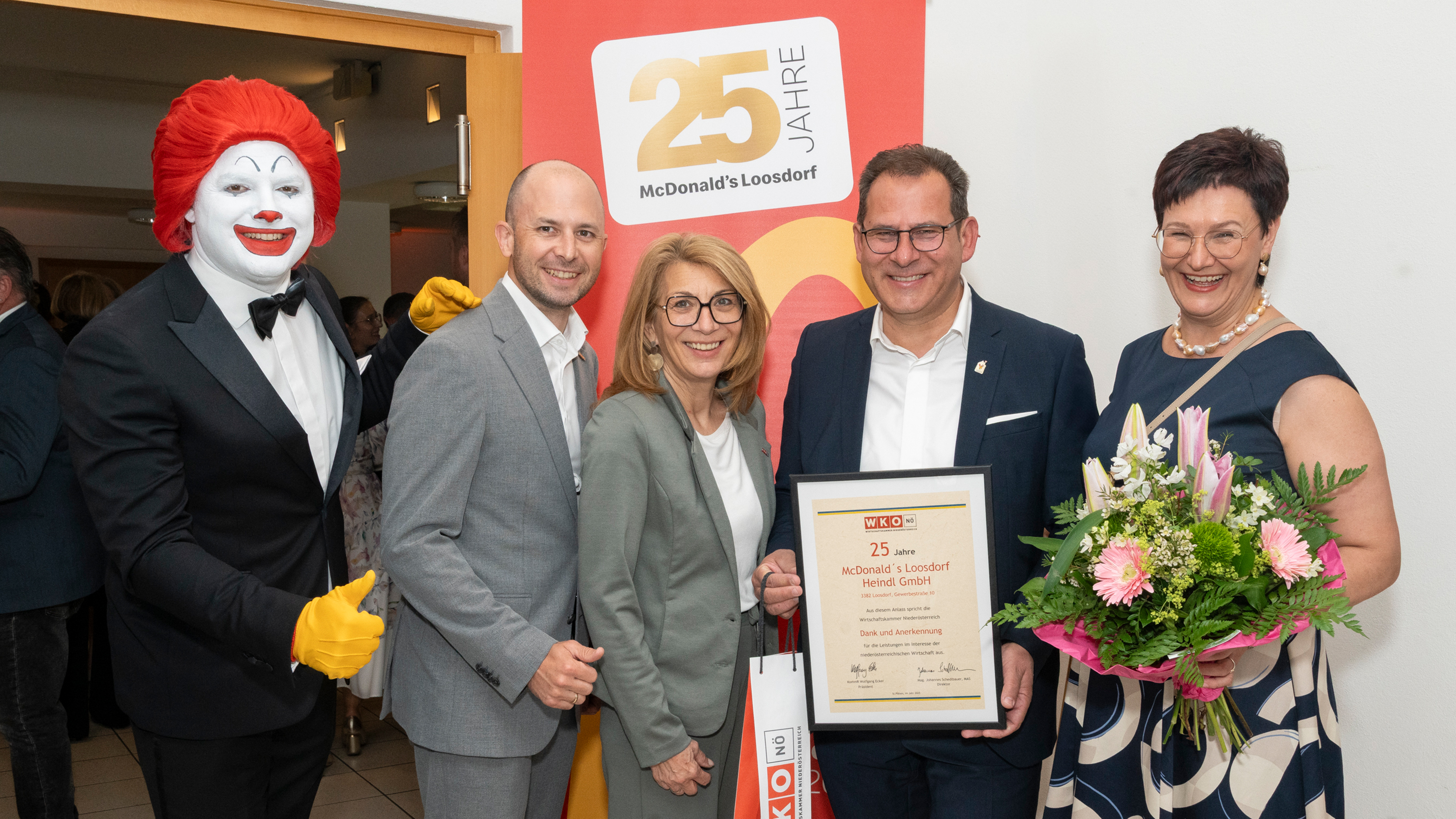 Bezirksstellenobfrau Silvia Rupp und Bezirksstellenleiter Andreas Hofbauer der Wirtschaftskammer Melk gratulieren herzlich zum 25-jährigen Firmenjubiläum McDonald´s Loosdorf.