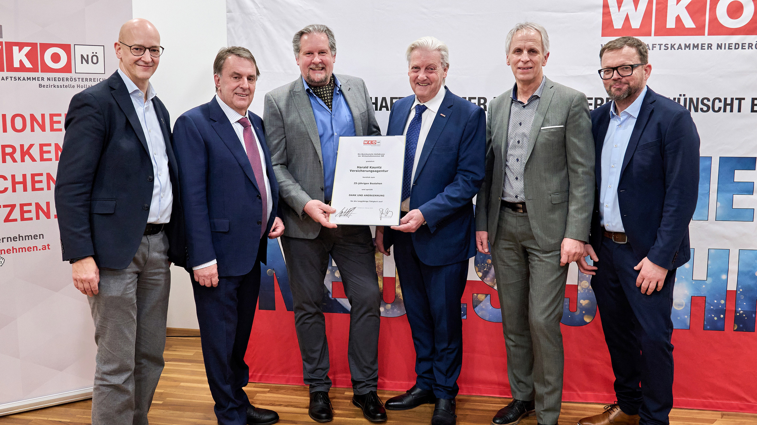 Harald Kauntz ist auch als Funktionär der Wirtschaftskammer Niederösterreich im Ausschuss der Versicherungsagenten und in der Prüfungskommission der Meisterprüfungsstelle tätig. Als Versicherungsspezialist legt er besonderen Wert auf „fachkundige Beratung und die Kooperation mit ausschließlich namhaften österreichischen Versicherungen,“, erklärt der Geschäftsinhaber anlässlich des 25-jährigen Bestehens seiner Agentur. WKNÖ-Präsident Wolfgang Ecker, Bezirksstellenobmann und Bürgermeister Alfred Babinsky (Hollabrunn), Landesgremialobmann Thomas Ableidinger (Versicherungsagenten), WKNÖ-Direktor Johannes Schedlbauer und Bezirksstellenleiter Julius Gelles gratulierten zum Jubiläum.