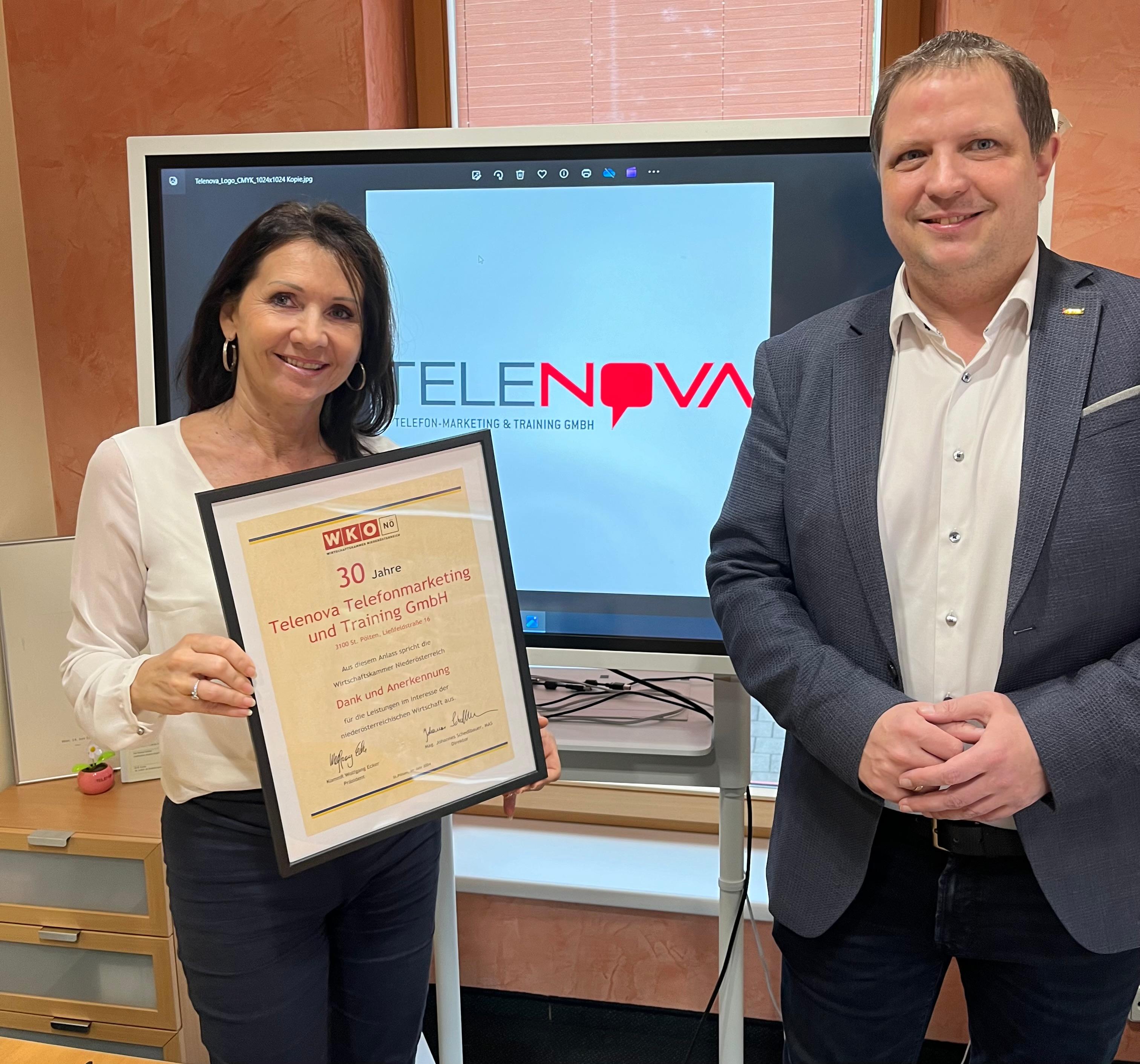 Bezirksstellenobmann Mario Burger gratulierte Ilse Wagner zum 30-jährigen Jubiläum der Telenova Telefonmarketing und Training GmbH und überreichte eine Urkunde der Wirtschaftskammer.