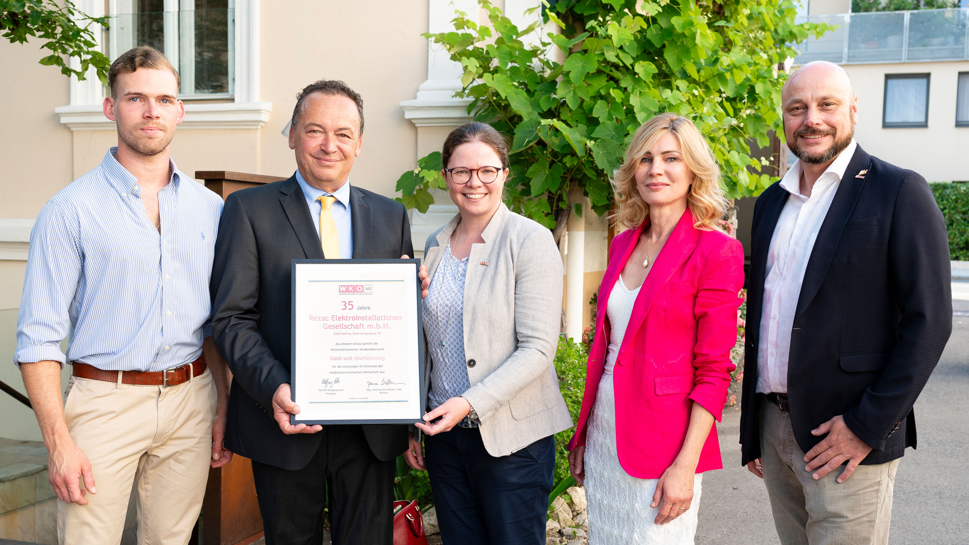 Seit 1989 gibt es die Firma Rezac Elektroinstallationen am gleichen Standort in der Babenbergergasse 10 in Mödling. Das Unternehmen widmet sich intensiv der Lehrlingsausbildung. „In meiner bisherigen Laufbahn habe ich ungefähr 60 Lehrlinge ausgebildet. Ich freue mich, dass mit meinem Sohn Stefan auch die künftige Nachfolge gesichert ist. Unsere wichtigsten Leitlinien sind Kompetenz, Qualität, Kundenfreundlichkeit und Zuverlässigkeit“, so Otto Rezac. Die Feier anlässlich des 35-jährigen Firmenjubiläums nutzten WK-Mödling Obmann Martin Fürndraht und Leiterin Andrea Lautermüller einerseits für Gratulationen und andererseits für Dankesworte an Otto Rezac, seines Zeichens engagierter Bezirksvertrauensmann für seine Branche und Initiator der Elektriker-Störungsdienste, welche im Bezirk Mödling einzigartig sind.