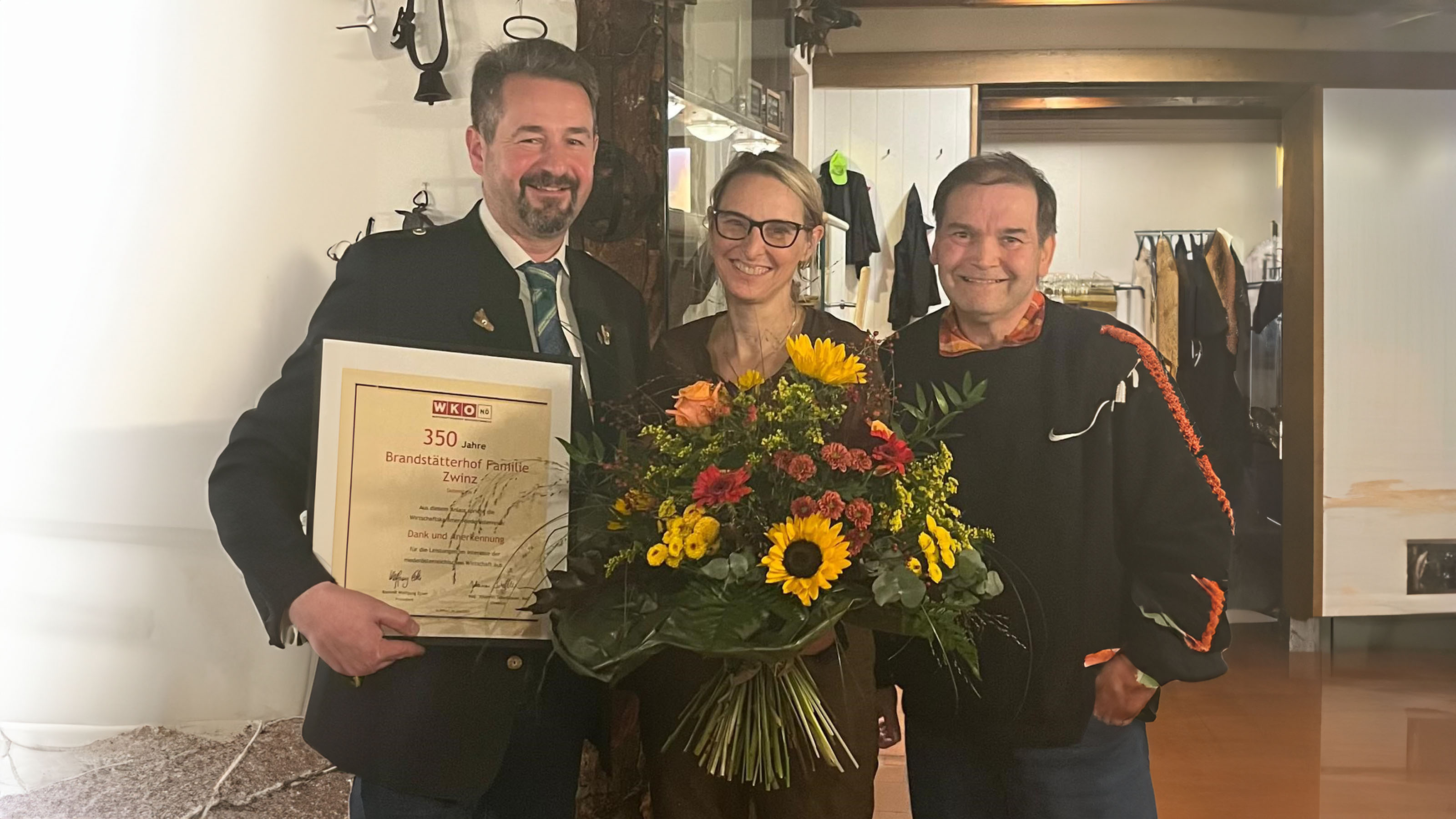 Bezirksstellenausschussmitglied Hans Fromwald überreichte der Familie Zwinz die Urkunde anlässlich des 350-jährigen Bestehens. Der "Brandstätterhof" ist seit vielen Generationen in Familienbesitz und steht für gelebte Tradition und Geschichte.