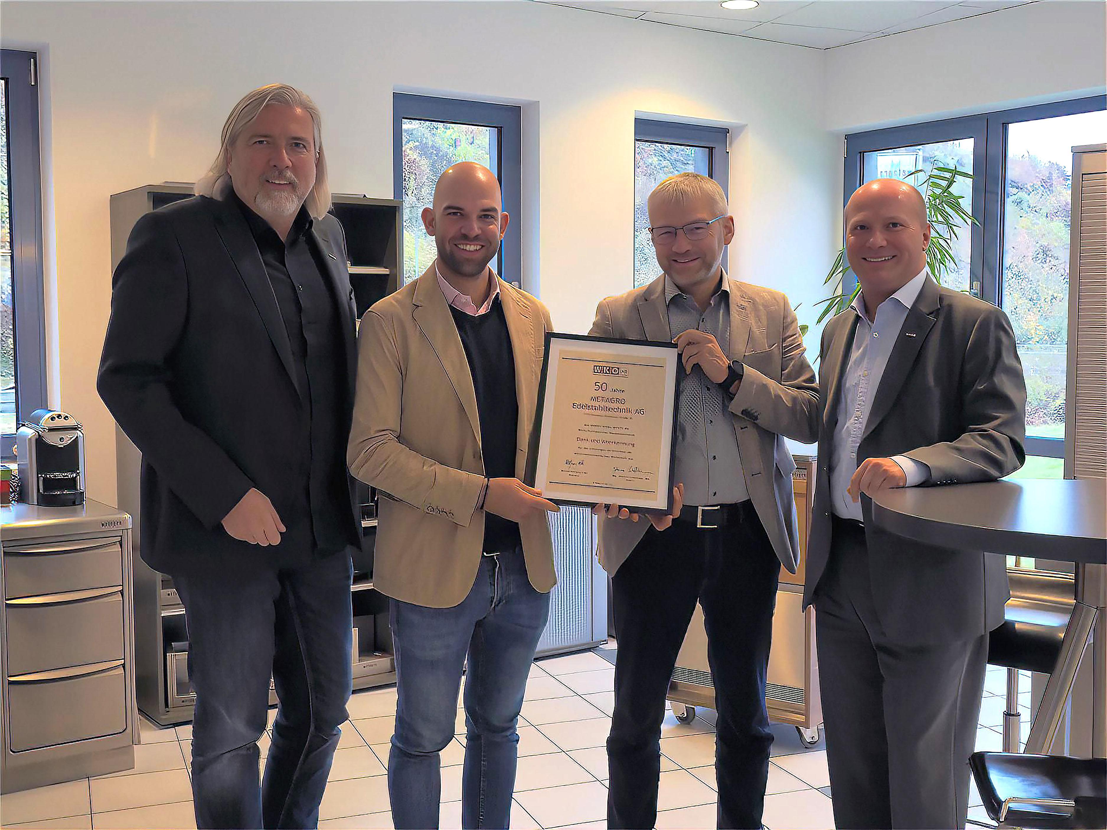 Bezirkstellenobmann Markus Leopold und Bezirksstellenleiter Georg Lintner gratulierten Vorstand Christoph Hofer und dem gewerberechtlichen Geschäftsführer Alfred Hochecker nachträglich zum 50. Jubiläum der Metagro Edelstahltechnik AG. Hochecker prästentierte den beiden WK-Vertretern die neuesten Innovationen der Firma Metagro.