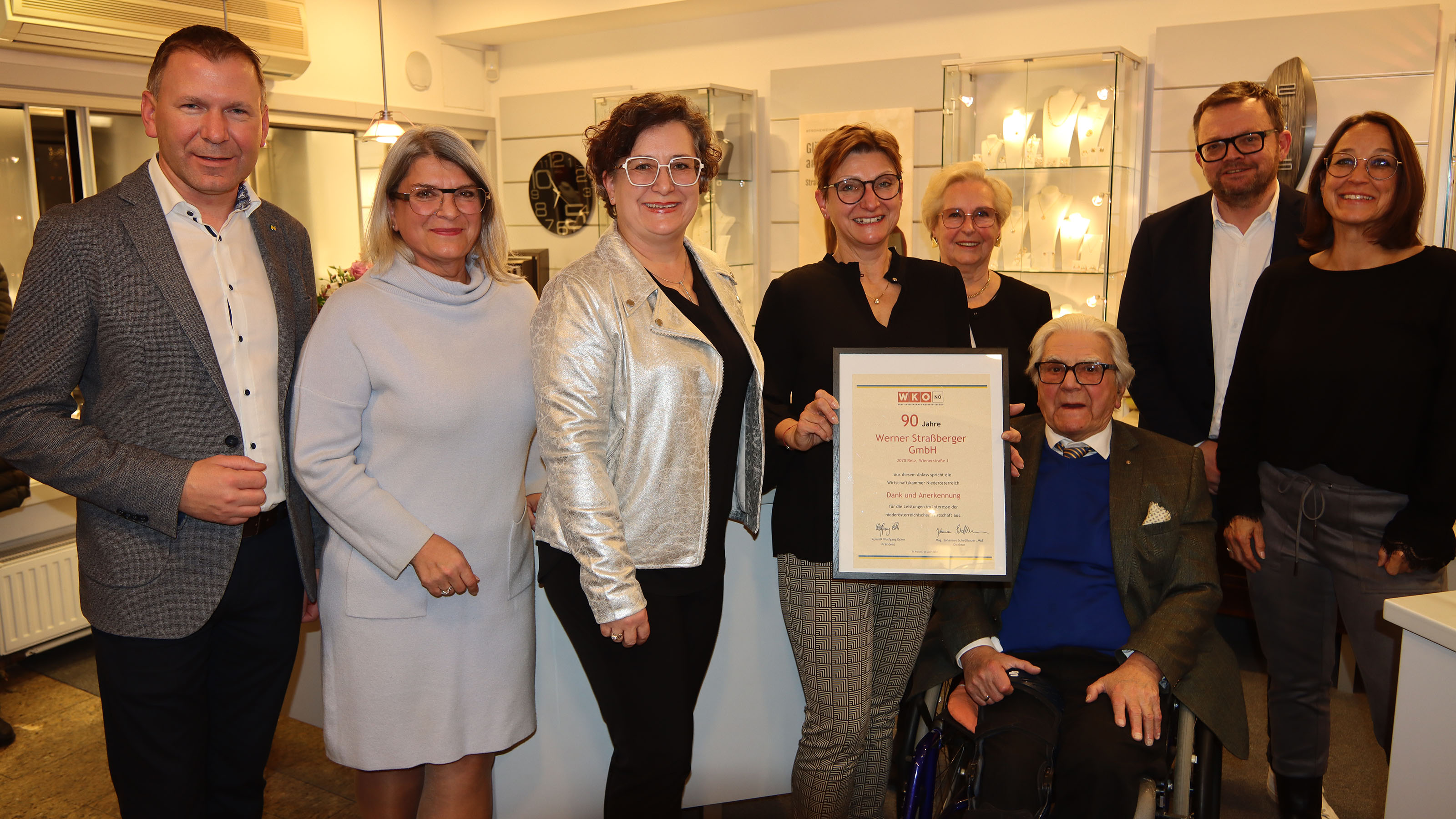Die Firma Straßberger stammt ursprünglich aus dem Waldviertel und ist schon 170 Jahre alt. Der Retzer Zweig wurde 1934 in Retz gegründet, zuerst in der Znaimerstraße. Erst 1938 wurde an den jetzigen Standort in der Wienerstraße 1 übersiedelt. In den vielen Jahrzehnten seit dem Bestehen hat es das Unternehmen Straßberger immer wieder geschafft, sich neu zu erfinden und an die wirtschaftlichen Gegebenheiten anzupassen. „Der Generation, die nach dem 2. Weltkrieg den Wiederaufbau geleistet hat, können wir nur größten Dank und Anerkennung aussprechen!“, richtete Bezirksstellenleiter Julius Gelles die Worte an die Seniorchefs KommR Werner und Ilse Straßberger. Bürgermeister Stefan Lang bedankte sich bei den Schwestern Astrid König und Christine Straßberger, die jetzigen Geschäftsführerinnen der Firma Werner Straßberger GmbH: „Euer Geschäft für Uhren, Schmuck, Optik, Kontaktlinsen und Hörgeräte ist seit vielen Jahren eine Institution in der Retzer Firmenlandschaft. Ihr entwickelt euch und euer Angebot ständig weiter und bietet euren Kundinnen und Kunden beste Qualität und Beratung in allen Bereich an!“