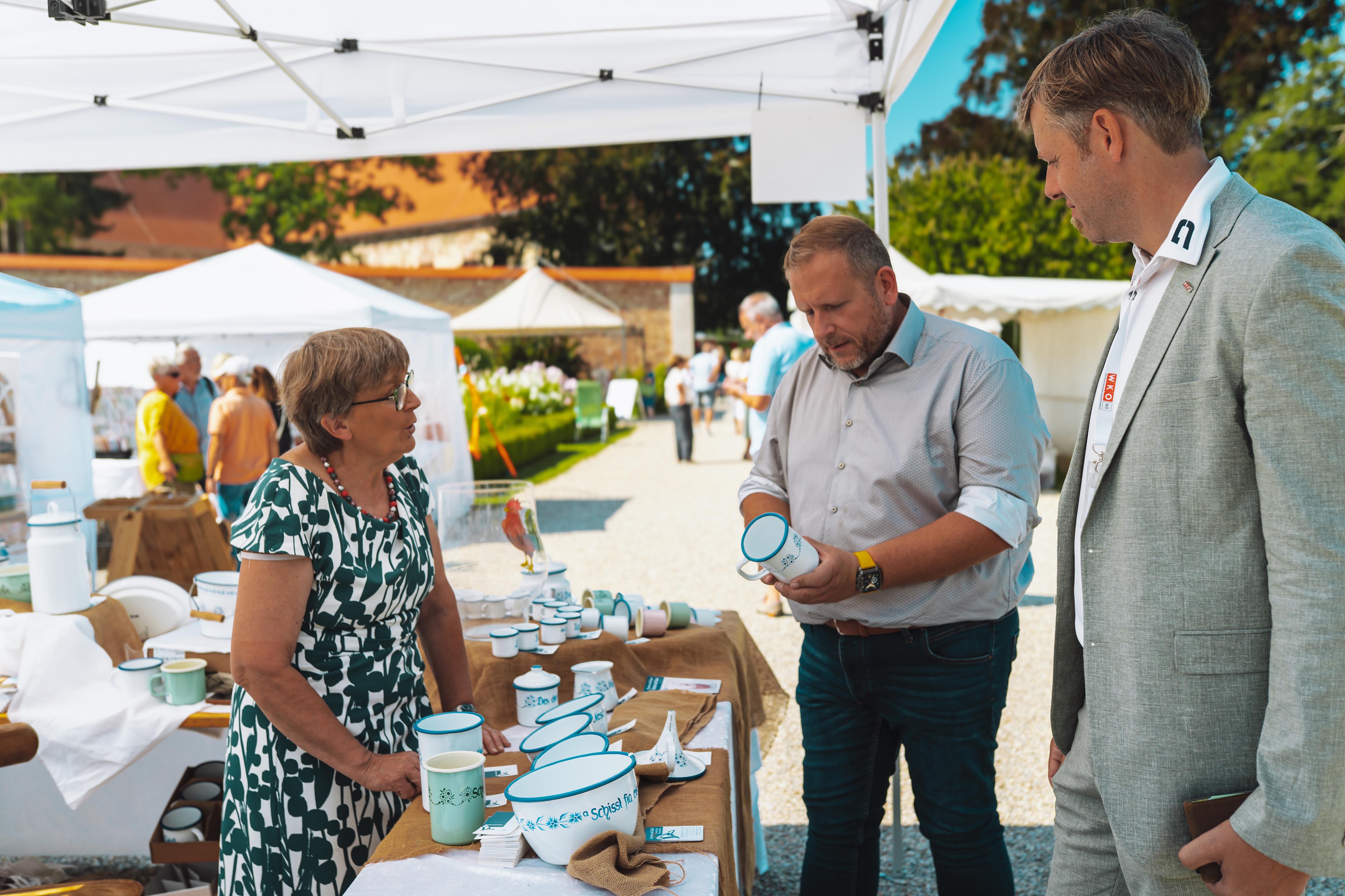 Kunst, Schmuck und Design standen vom 8. bis 10. August im Zentrum der KunstWerkTage auf der Schallaburg. Rund 80 Ausstellerinnen und Aussteller aus dem Kunsthandwerk sorgten im Schlossgarten und auf der Schießstätte für großes Interesse und absolute Begeisterung bei den Besucherinnen und Besuchern. „Unser niederösterreichisches Kunsthandwerk steht für Produkte in höchster Qualität und mit dem gewissen Etwas“, freute sich Thomas Fessel, der Landesinnungsmeister der NÖ Kunsthandwerke über den Erfolg. Auch Jochen Flicker, der Obmann der Sparte Gewerbe und Handwerk in der Wirtschaftskammer Niederösterreich (WKNÖ), war begeistert. „Die Vielfalt der Produkte und die Kreativität unserer Kunsthandwerkerinnen und Kunsthandwerker ist einfach zutiefst beeindruckend.“