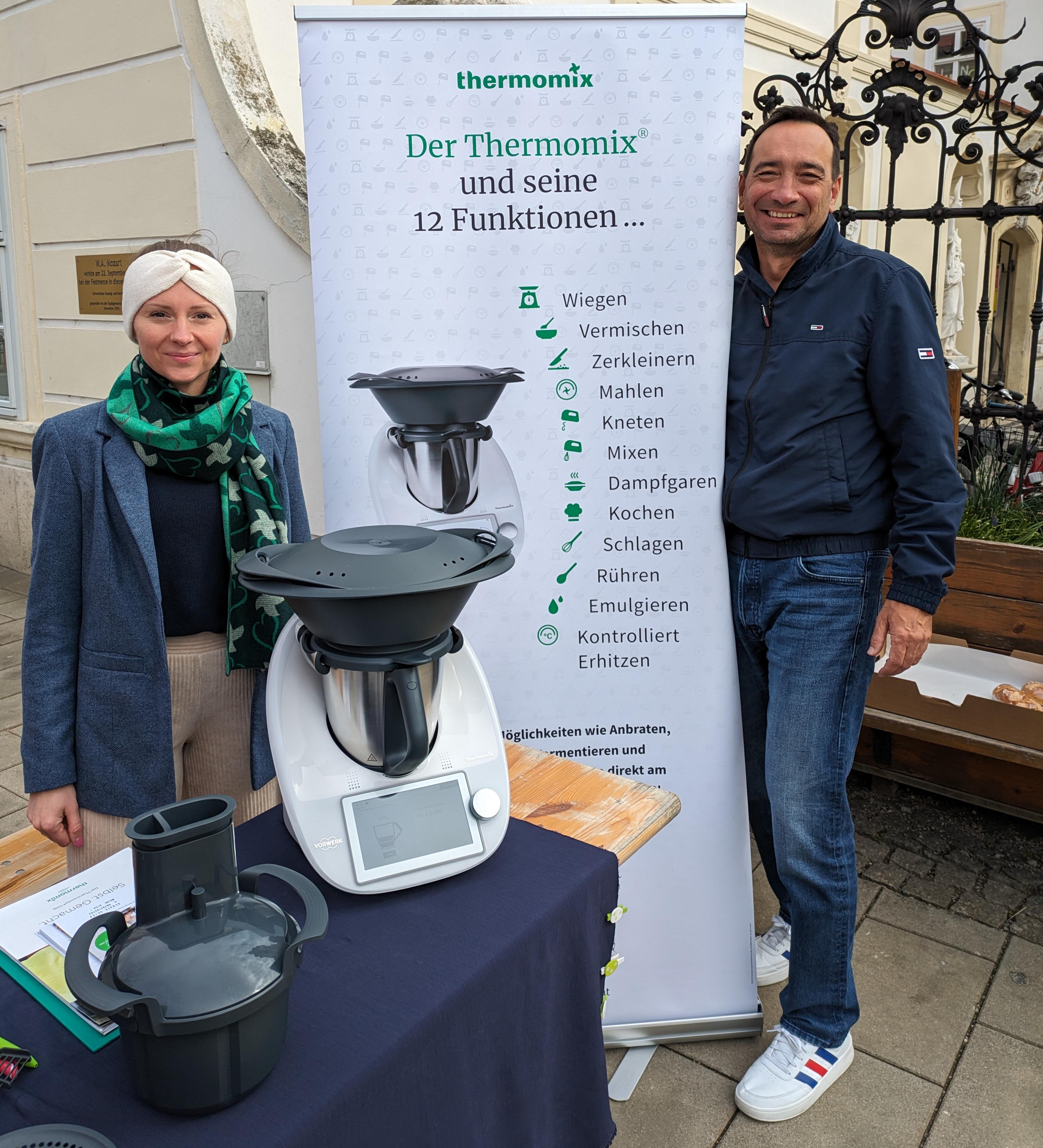 Außenstellenleiter Mario Freiberger besuchte die rastlose Unternehmerin Renate Geier am Schwechater Wochenmarkt. Die Hobby-Köchin vertreibt das vielseitige Küchengerät Thermomix und schwärmte vor Ort von den Unmengen an Funktionen der Küchenmaschine. Neben Ihrem Unternehmen ist Sie für die Organisation der Familienmesse „Mein Unser“ im Schloss Freyenthurn in Mannswörth verantwortlich. Diese Messe vernetzt Konsumenten und Unternehmen aus der Region 2x im Jahr – der Auftakt am 9. März 2024 war sehr erfolgreich.
