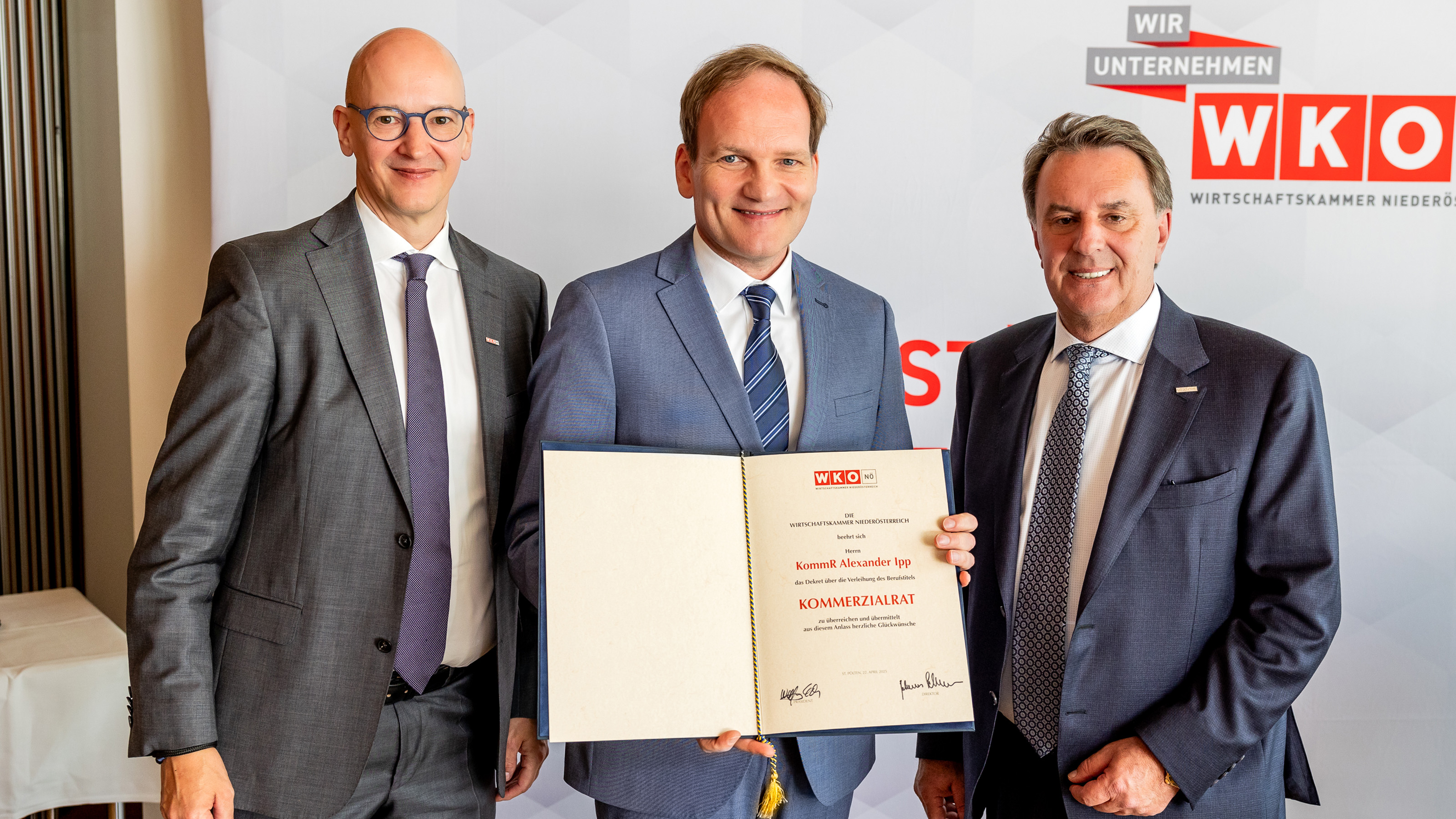 Als verdienter Vertreter der Wirtschaft wurde Alexander Ipp von der Wirtschaftskammer dafür vorgeschlagen - durch die Entschließung von Bundespräsident Alexander Van der Bellen ist der renommierte Hotelier berechtigt, den Berufstitel „Kommerzialrat“ zu führen. WKNÖ-Präsident Wolfgang Ecker gratulierte Alexander Ipp bei der feierlichen Überreichung des Dekrets.