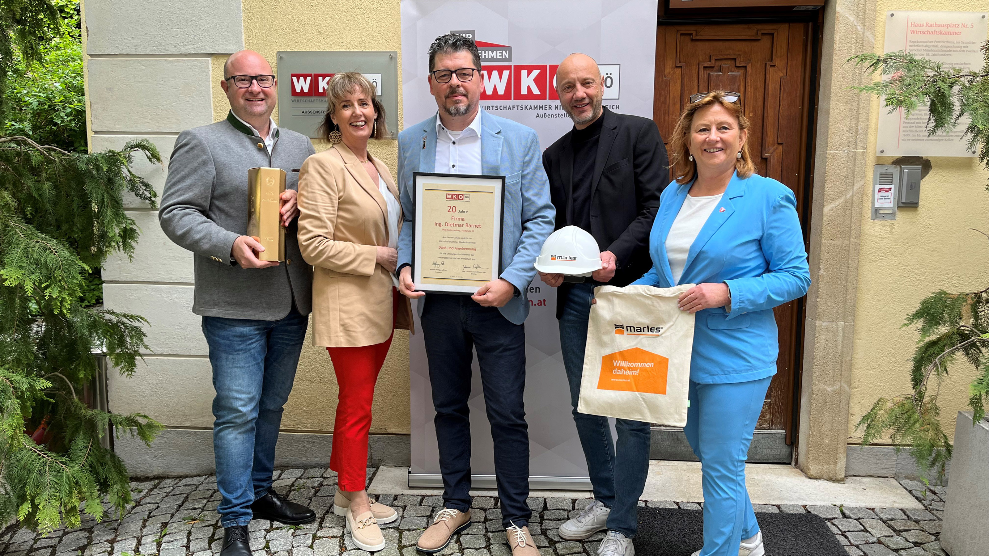 Das Team der Wirtschaftskammer Klosterneuburg WK-Obmann Markus Fuchs, WK-Leiter Mag. Friedrich Oelschlägel, seine Ehegattin und FiW Vorsitzende Martina Polndorfer sowie Vizebürgermeisterin DI, Dr. Maria Theresia gratulierten Ing. Dietmar Barnet zu seinem 20 - jährigen Firmenjubiläum im Bereich Fertigteilhausbau mit einer Urkunde und wünschten ihm weiterhin viel Erfolg!