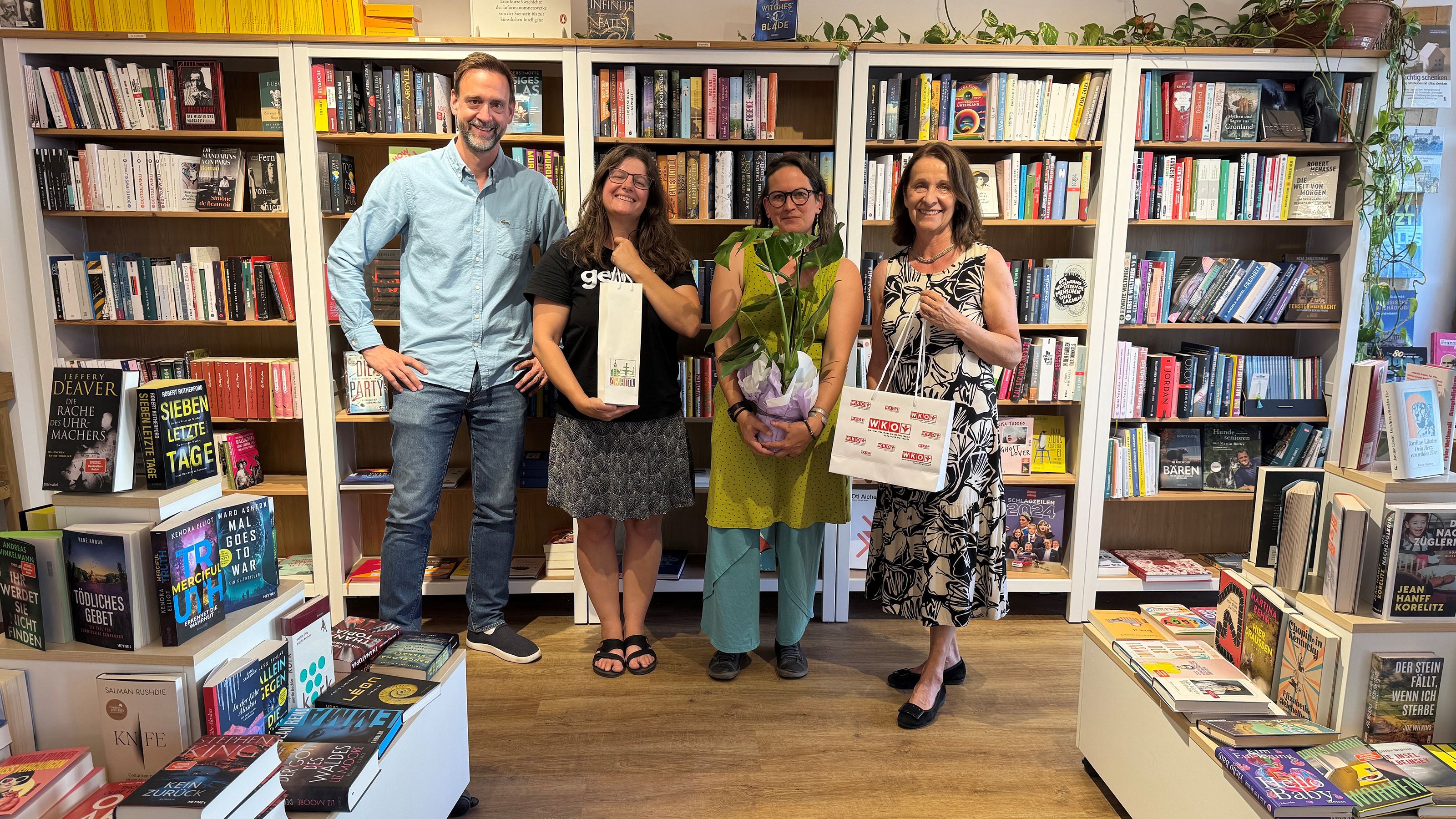 Bezirksstellenobfrau Anne Blauensteiner und Wirtschaftsstadtrat Thomas Weiss freuen sich über die Weiterführung der Buchhandlung und wünschen den beiden Unternehmerinnen viel Erfolg!