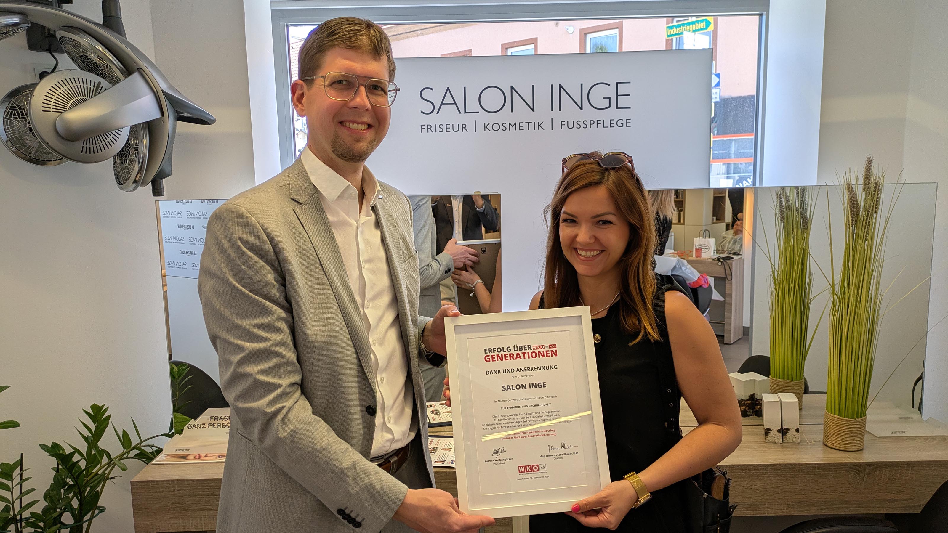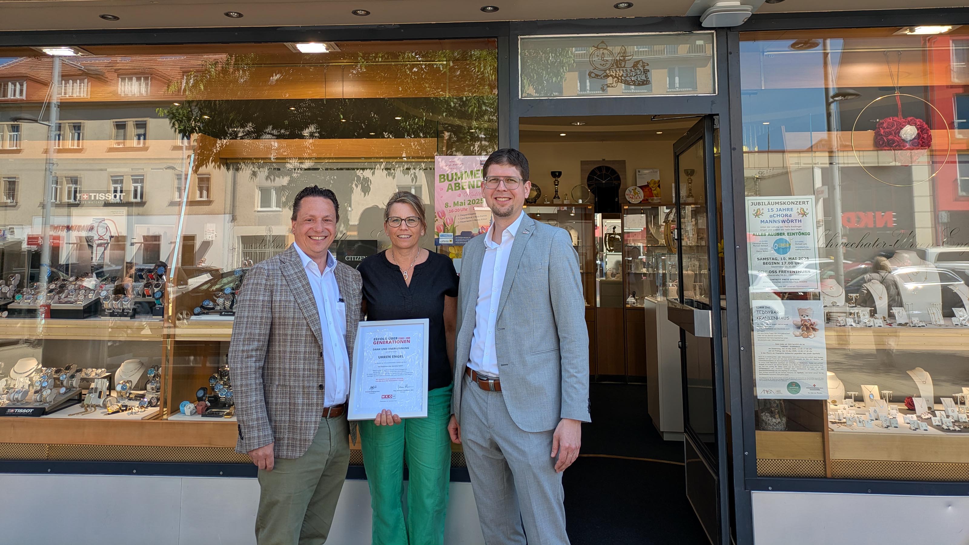 Im Raum Schwechat haben wir viele tolle Unternehmen die teilweise seit Generationen bestehen. Außenstellenobmann Mathias Past überreichte als kleine Anerkennung eine Urkunde an Sonja Woller und Thomas Woller vom Schwechater Uhren-Engel, Pia Ertl vom SALON INGE mit Standorten in Schwechat und Himberg sowie an Walter Blacky von WB Chemie in Leopoldsdorf!“