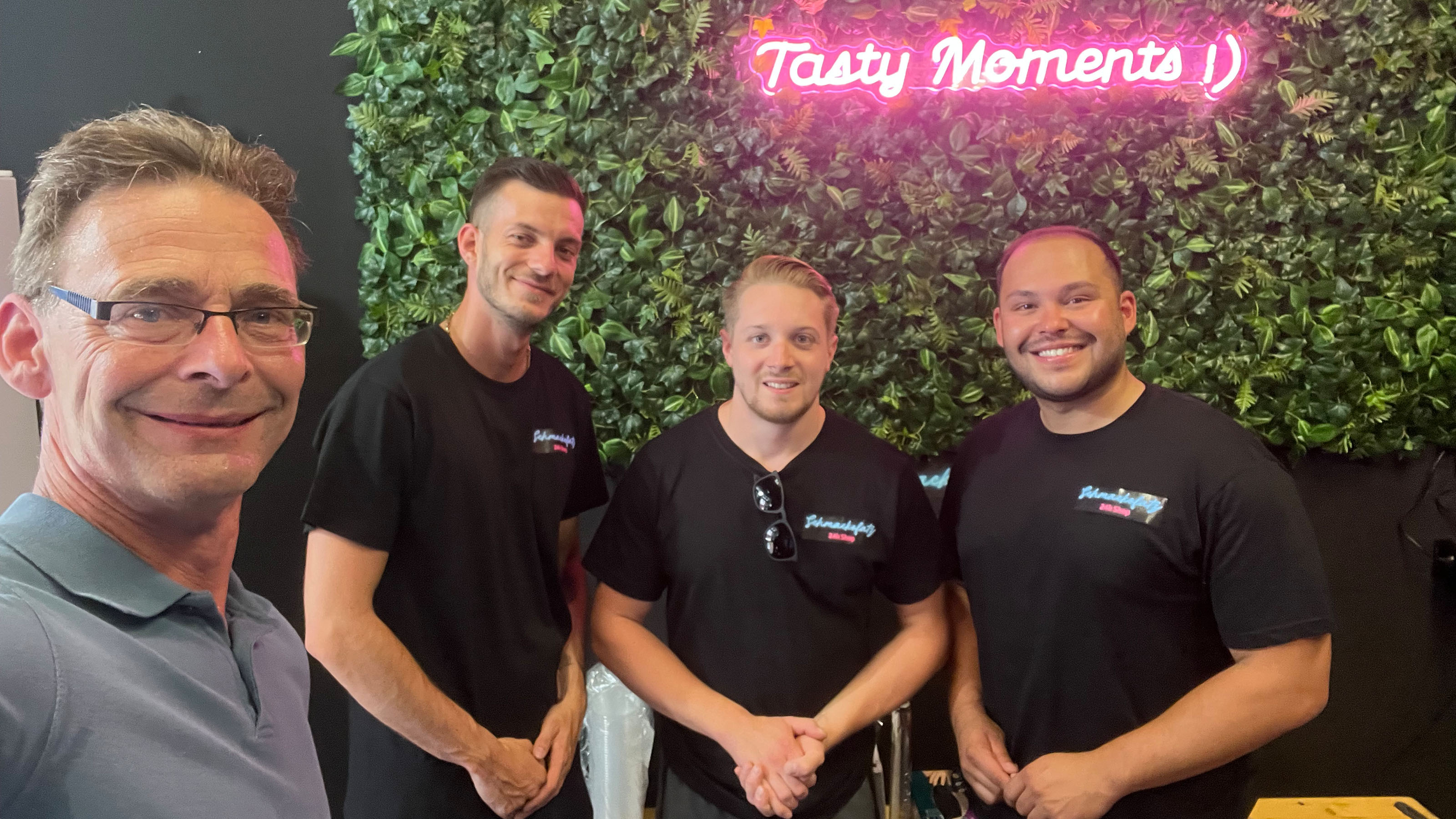 Bezirksstellenleiter Gernot Binder gratulierte den Gründern der MAB Schmackofatz GmbH zur Eröffnung beim Franziskanergassenfest und wünschte alles Gute für die Zukunft.