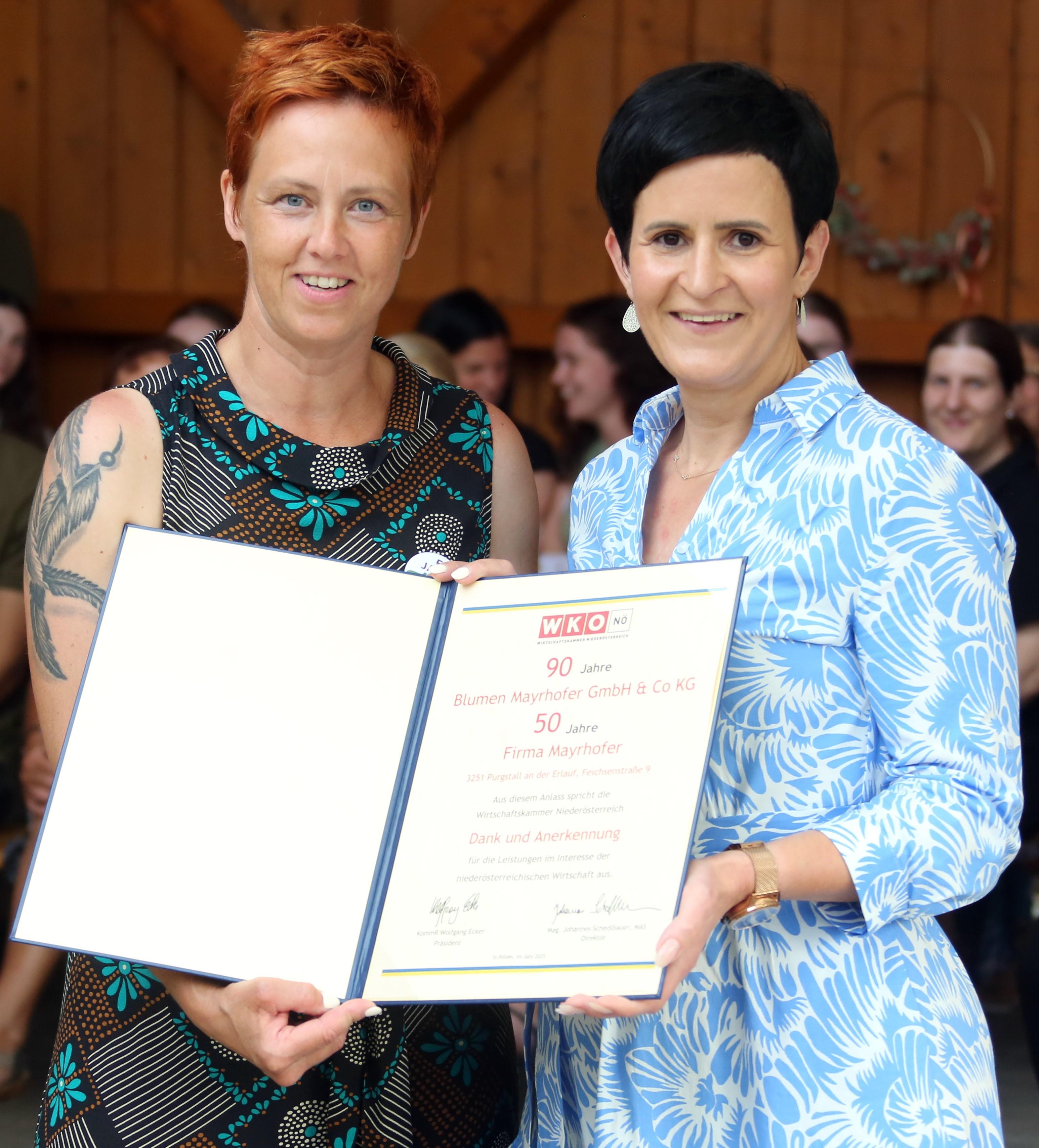90 Jahre Gewerbebetrieb sowie der runde Geburtstag der Chefin wurden bei Blumen Mayrhofer in Purgstall gebührend gefeiert. Um 1900 als landwirtschaftlicher Betrieb Kitzmüller gestartet und seit 50 Jahren als Blumen Mayrhofer im Erlauftal an drei Standorten tätig. Martina Mayrhofer führt seit 2017 den Betrieb welchen sie von ihrer Mutter übernommen hat, mit umfassenden Angeboten im Bereich Floristik, Gärtnerei und Gartenservice. Bezirksstellenobfrau Silvia Teufl überraschte die Jubilarin mit einem wundervollen Blumenstrauß aus dem eigenen Betrieb sowie einer Jubiläumsurkunde der Wirtschaftskammer Niederösterreich.