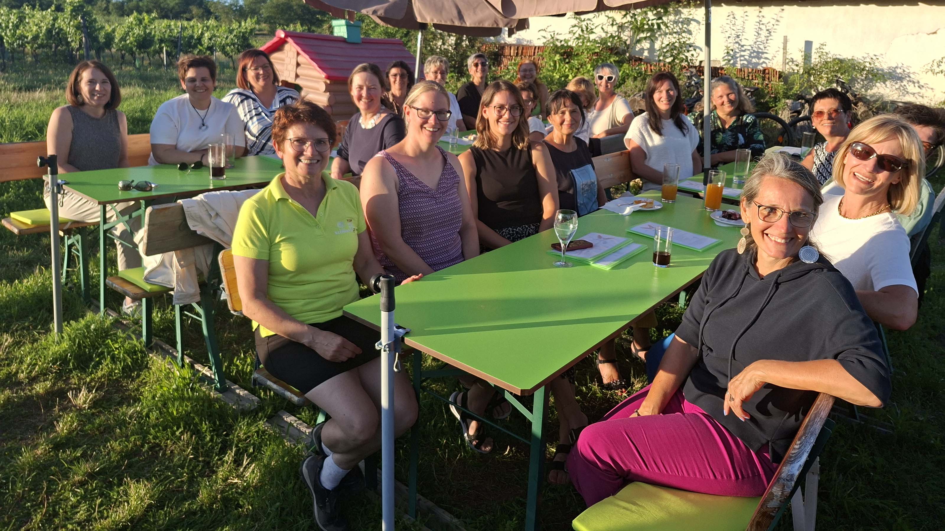 An einem lauen Sommerabend trafen sich Unternehmerinnen zum Afterwork-Treffen von Frau in der Wirtschaft Hollabrunn beim traditionsreichen TOP-Heurigen Schwayer in der idyllischen Kellergasse Zellerndorf. Der Heurige bietet ein einzigartiges Ambiente mit Blick in die Weingärten, begleitet von ausgezeichnetem Wein, köstlichem Essen und bester Stimmung.