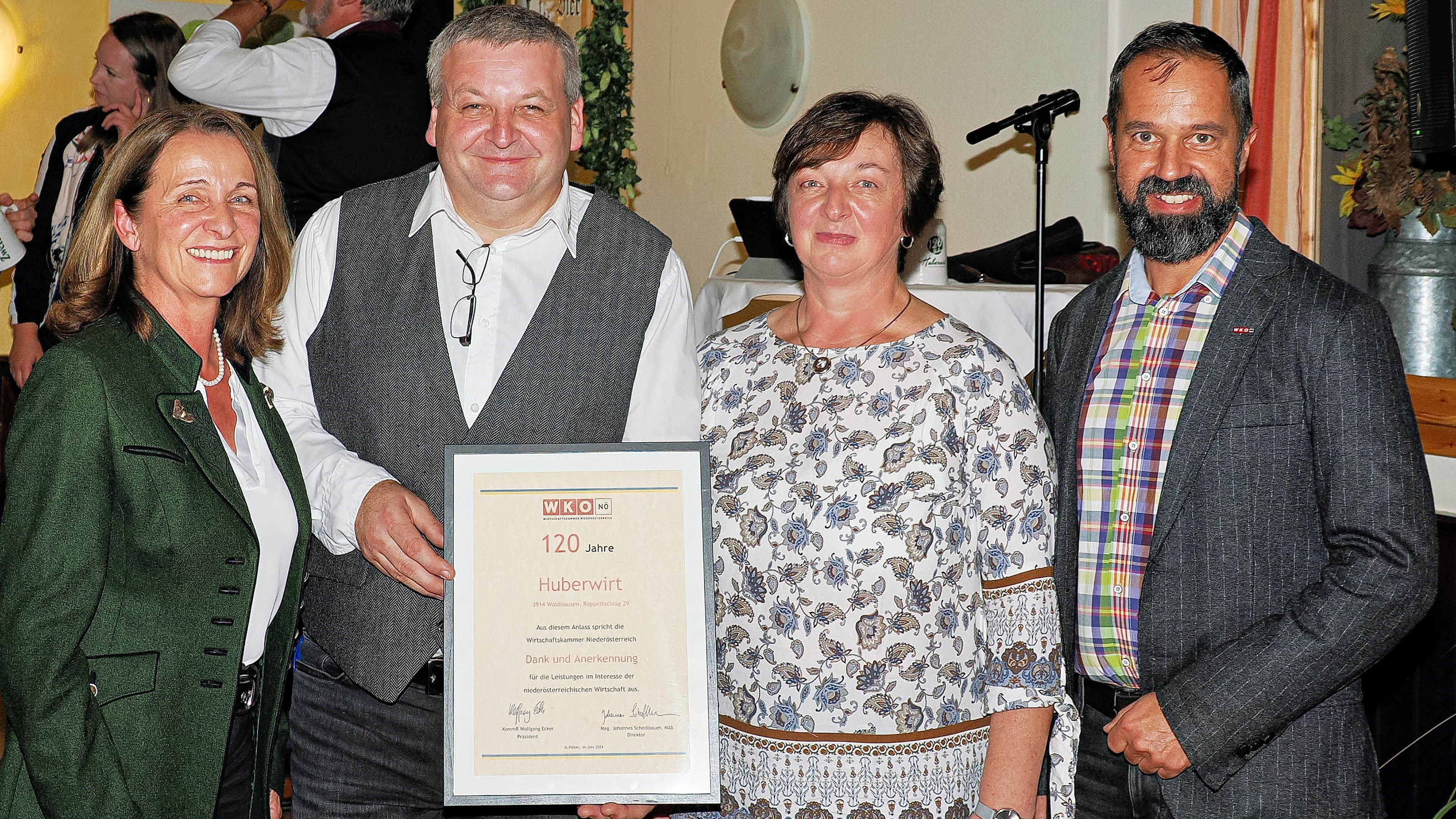 Ein besonderes Jubiläum konnte Familie Huber letztens feiern. Seit 120 Jahren schon besteht das Gasthaus, welches aktuell von Sabine und Martin Huber in der vierten Generation geführt wird. Zahlreiche Gäste kamen, um zu gratulieren und wurden von der Weltmeisterin (2024) auf der steirischen Harmonika, Klara Mißebner, und ihren Brüdern Bruno & Felix (Mißebner Trio) unterhalten. Aufgrund seiner Leidenschaft fürs Harmonikaspielen betreibt Martin Huber noch neben dem Gasthaus seit 1997 einen Handel mit steirischen Harmonikas & Akkordeons.