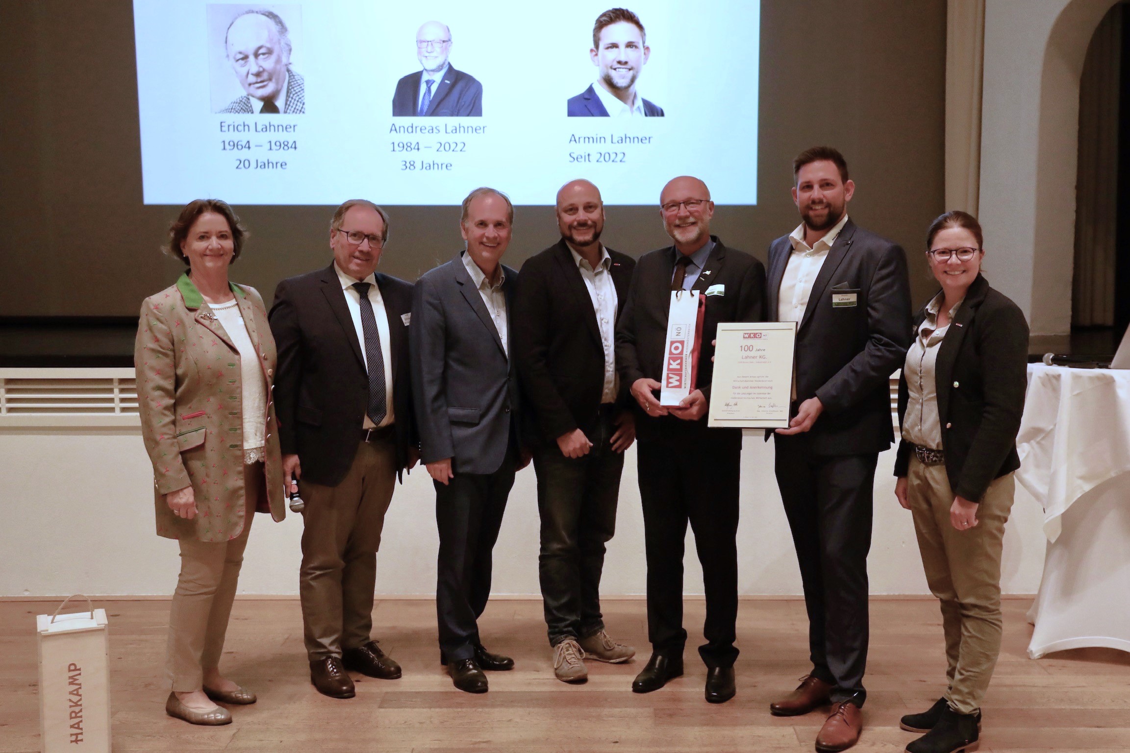 WKNÖ-Vizepräsident Erich Moser, WK-Mödling Bezirksstellenobmann Martin Fürndraht und Bezirksstellenleiterin Andrea Lautermüller gratulierten Andreas und Armin Lahner zum 100-jährigen Bestehen.