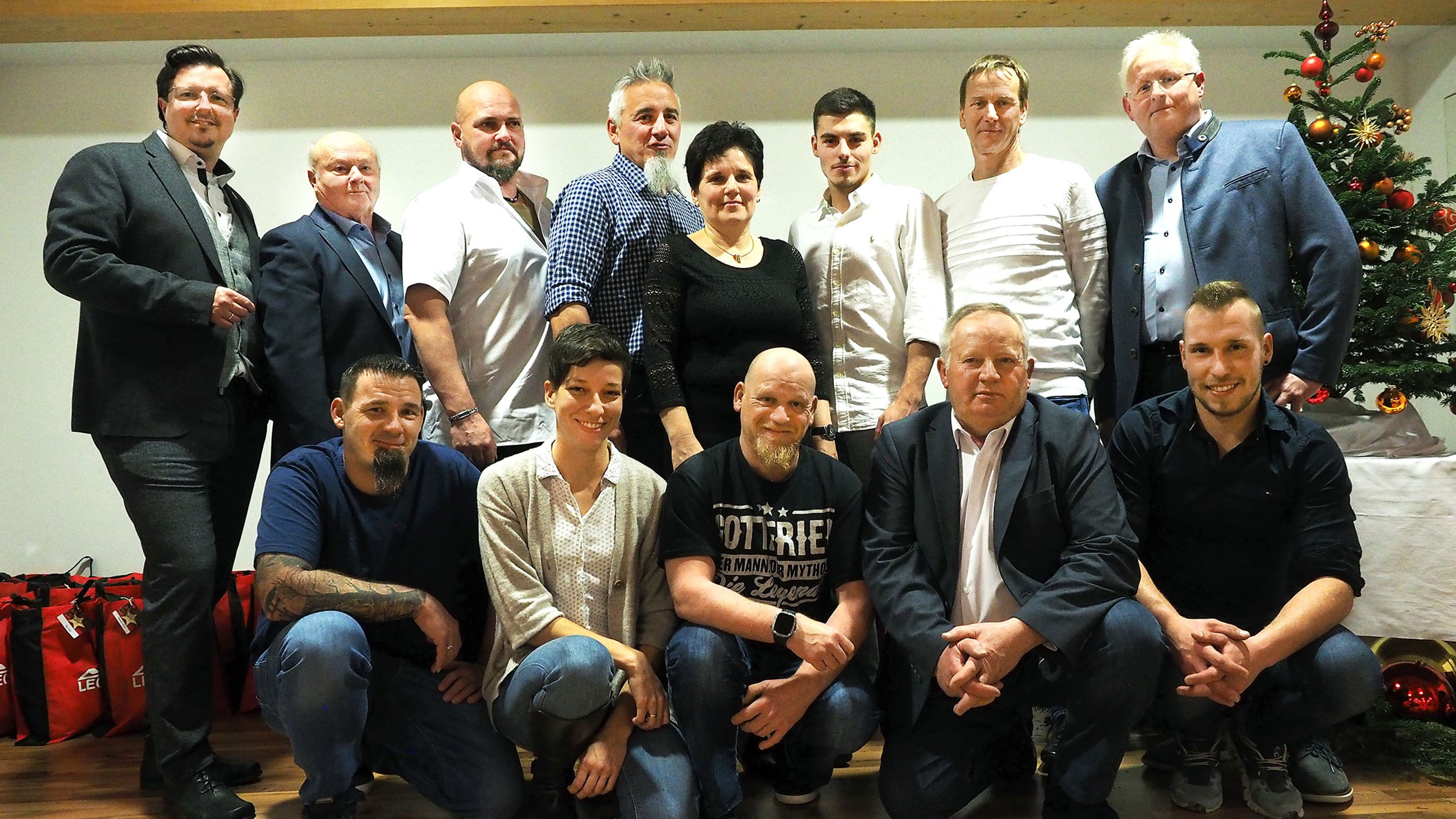 1. Reihe v.l.: Jürgen Hauer (Vorarbeiter Hochbau, 10 J.), Anna Kolm (kaufmännische Angestellte Kaminsanierung, 5 J.), Gottfried Aigner (Facharbeiter Hochbau, 10 J.), Stanislaw Leszko (Vorarbeiter Kaminsanierung, 20 J.), Nico Hirt (Facharbeiter Hochbau, 10 J.),