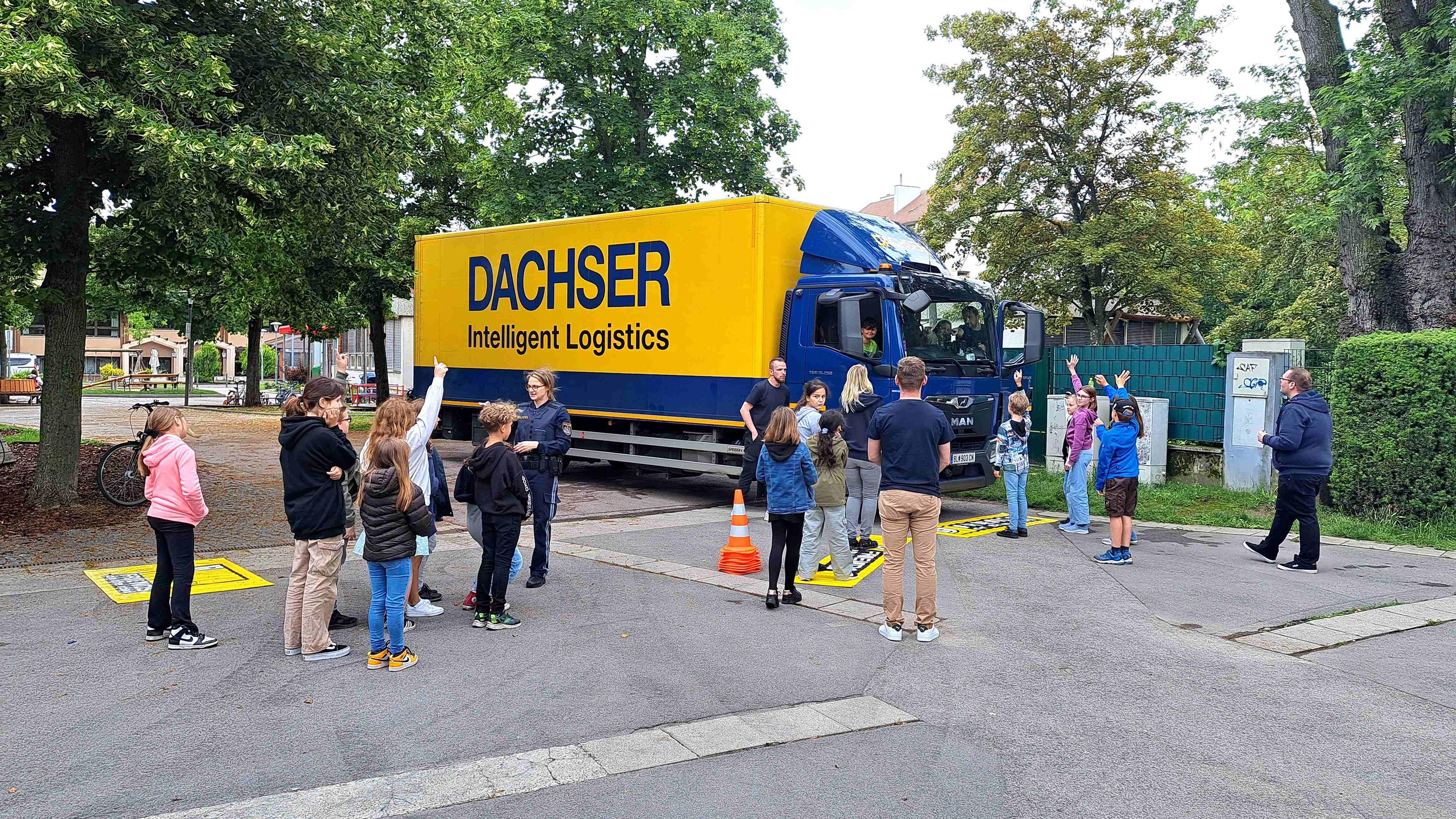 So besuchte auch ein Lkw der Dachser-Austria Gesellschaft m.b.H. (Niederlassung Himberg) die Volksschule in Himberg.