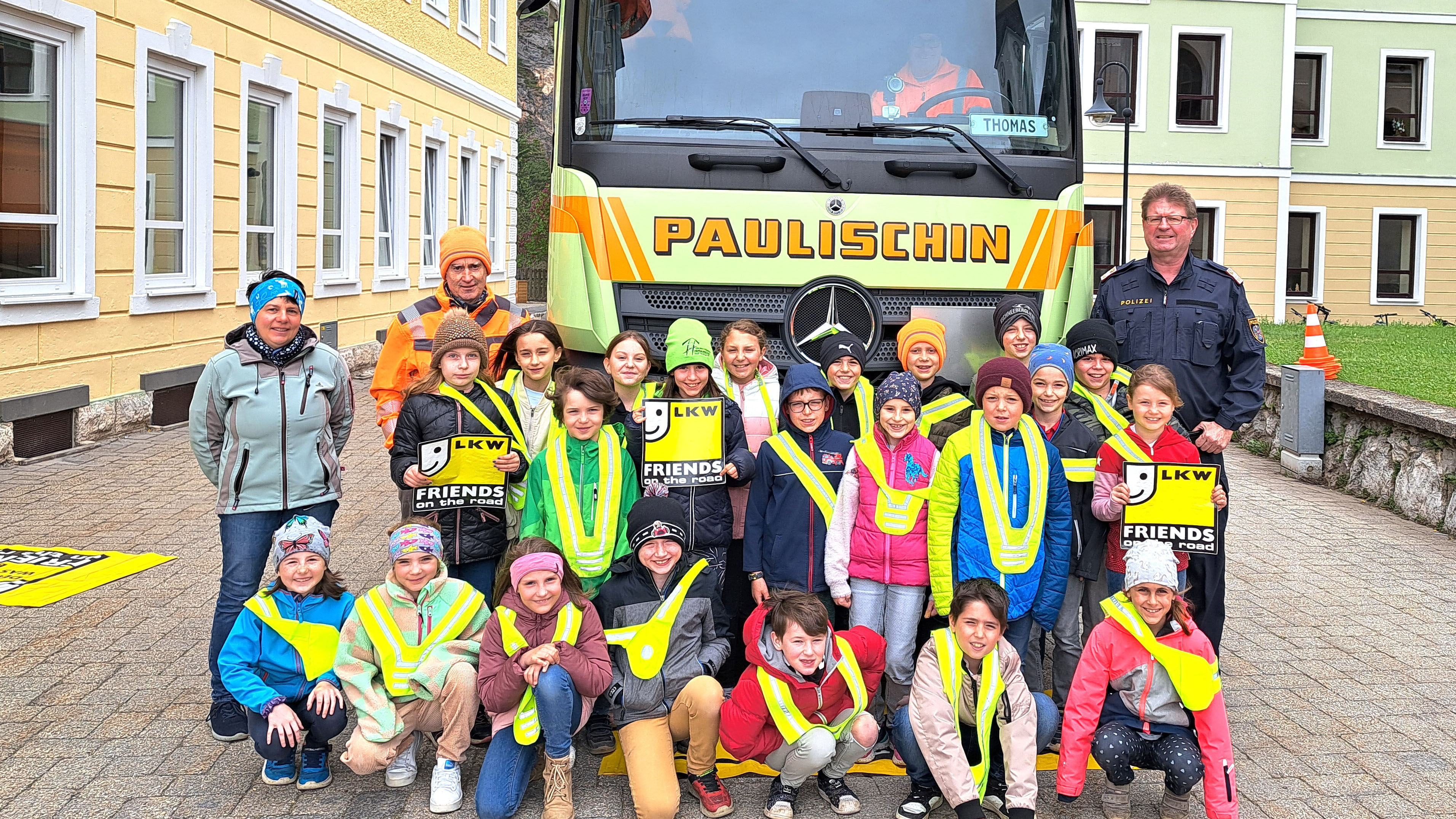 In je einem Workshop erarbeiteten die Kinder der dritten und vierten Klasse am Mittwoch, den 10. April gemeinsam mit Franz Paulischin und Workshop-Leiterin Elke Winkler auf spielerische Art alles Wissenswerte zum Thema Lkw – besonderer Schwerpunkt dabei ist immer die Sicherheit im Straßenverkehr. Zu diesem Thema unterstützte auch die Polizei durch Inspektor Roland Hofer.
