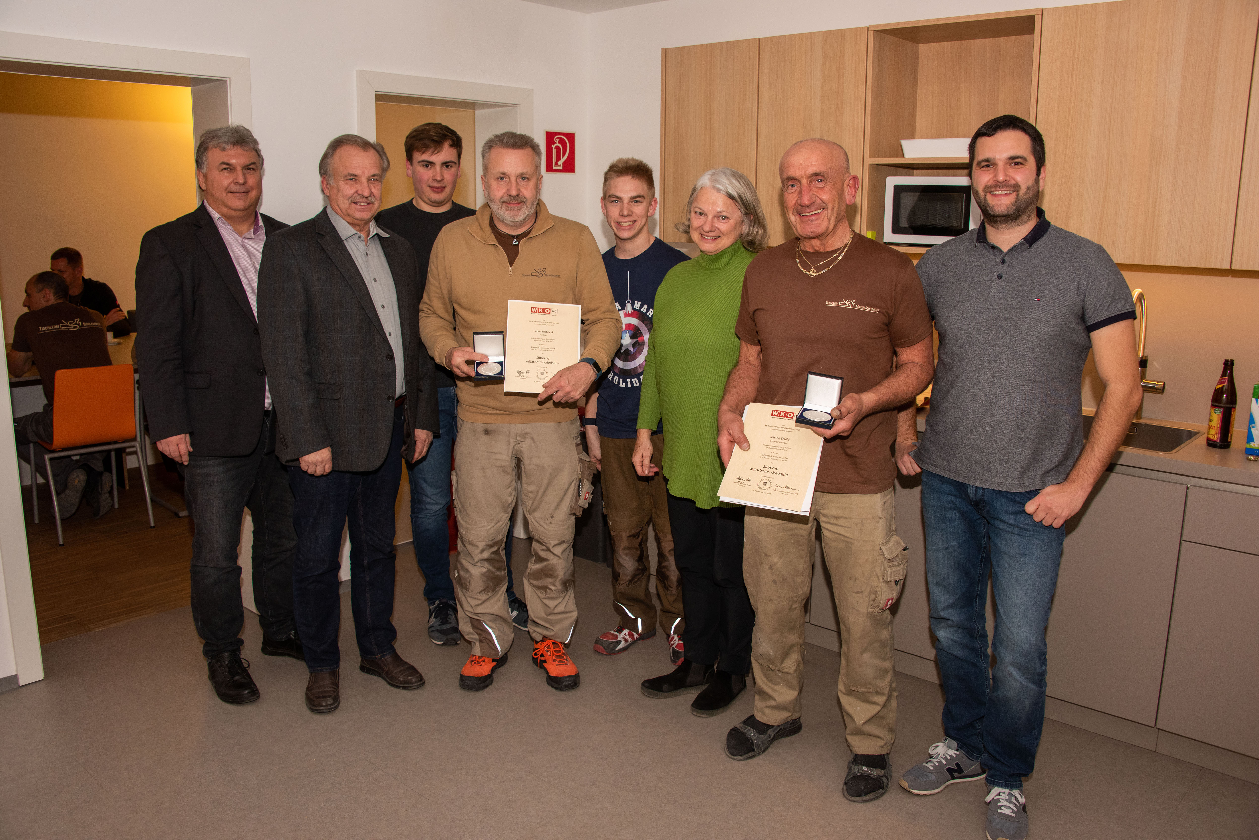 Im Rahmen der jährlichen Weihnachtsfeier bei der Tischlerei Schlemmer in Poysdorf überreichte Bezirksstellenleiter Klaus Kaweczka an die langjährigen Mitarbeiter Lubos Tochacek, Tischler und Johann Schild, Werkstättenleiter die Silberne Mitarbeitermedaille samt Urkunde für 30-jährige Betriebszugehörigkeit.