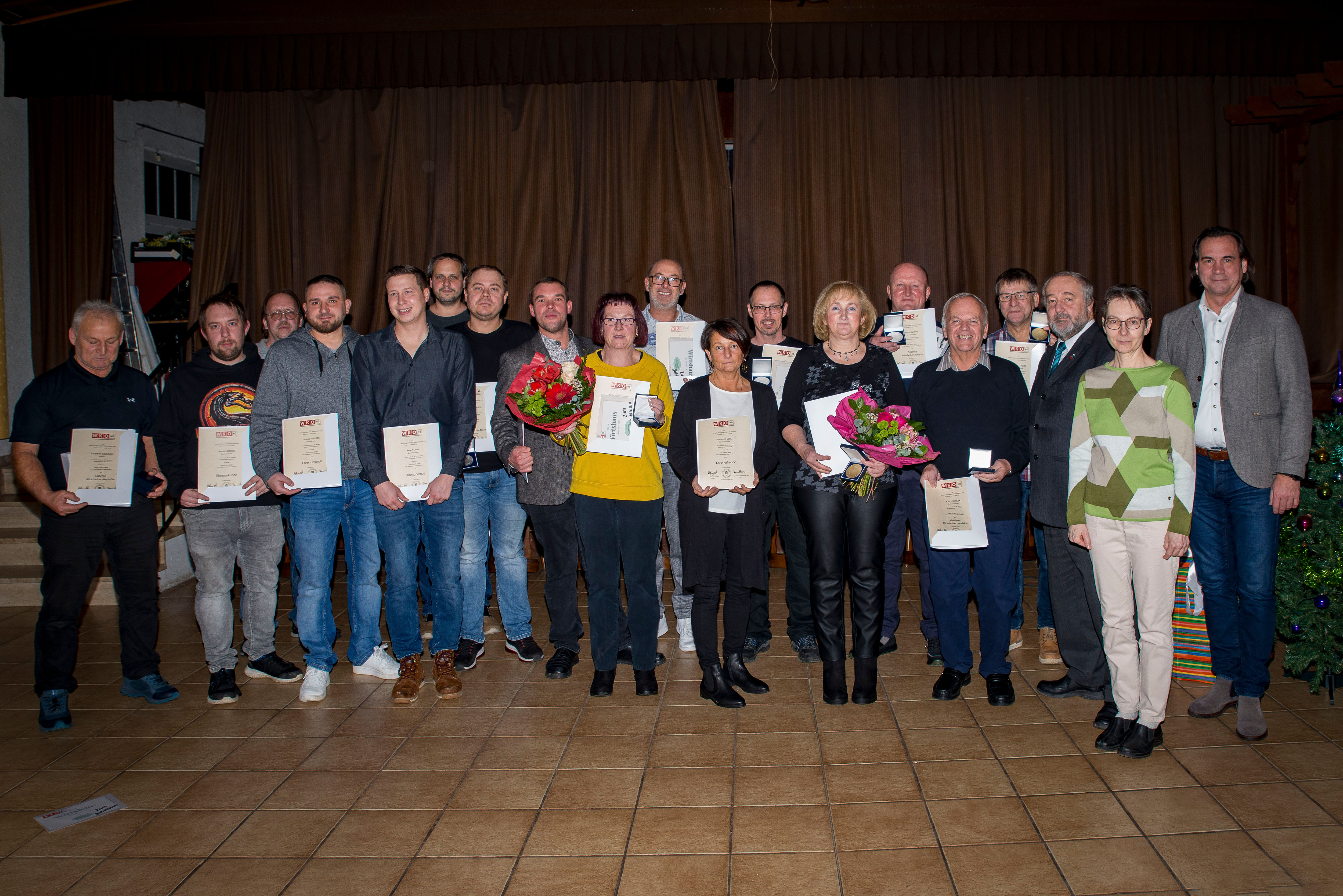 Bezirksstellenobmann Christian Bauer überreichte im Namen der Wirtschaftskammer NÖ Blumen, Medaillen und Urkunden an die Jubilare und Jubilarinnen.