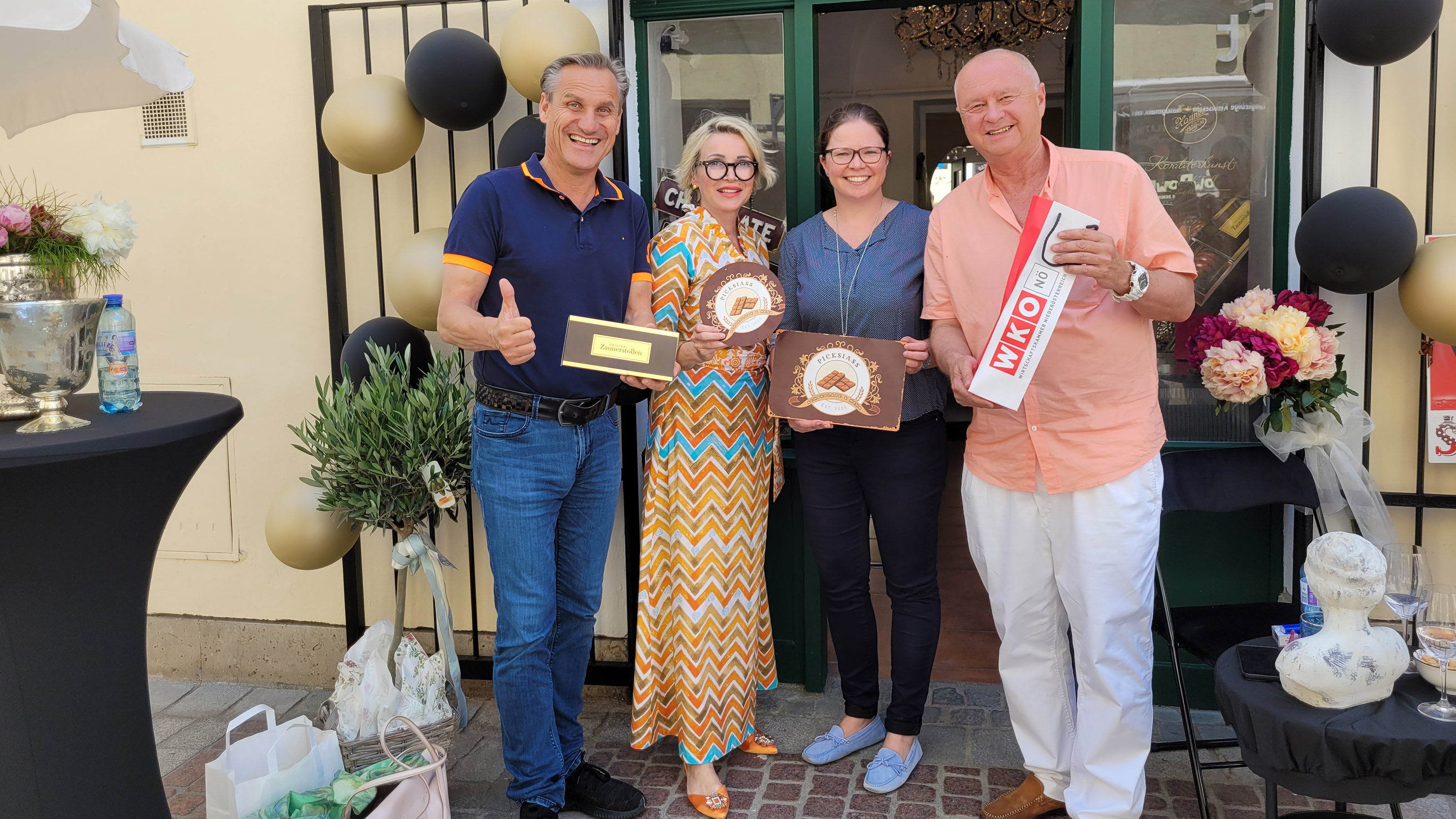 WK-Mödling Bezirksstellenleiterin Andrea Lautermüller und Gert Zaunbauer gratulierten Bürgermeister a.D. Hans Stefan Hintner zur Eröffnung des Schokoladengeschäftes „Picksiass“ am Schrannenplatz 1. Mit viel Liebe zum Detail eröffnete Hintner gemeinsam mit seiner Lebensgefährtin Karin Bittermann die Pforten einer ehemaligen Trafik im Mödlinger Rathaus. Das Sortiment verspricht jede Menge süße Verführung – von Schokolade vom „Schoko-Michi“ bis hin zum echten Zaunerstollen. „Es ist erfreulich zu sehen, wie ehemalige politische Verantwortungsträger ihre Erfahrungen und ihr Engagement in neue Projekte einbringen. „Picksiass“ ist ein weiteres Beispiel für die lebendige Unternehmenskultur in Mödling“, so Lautermüller.