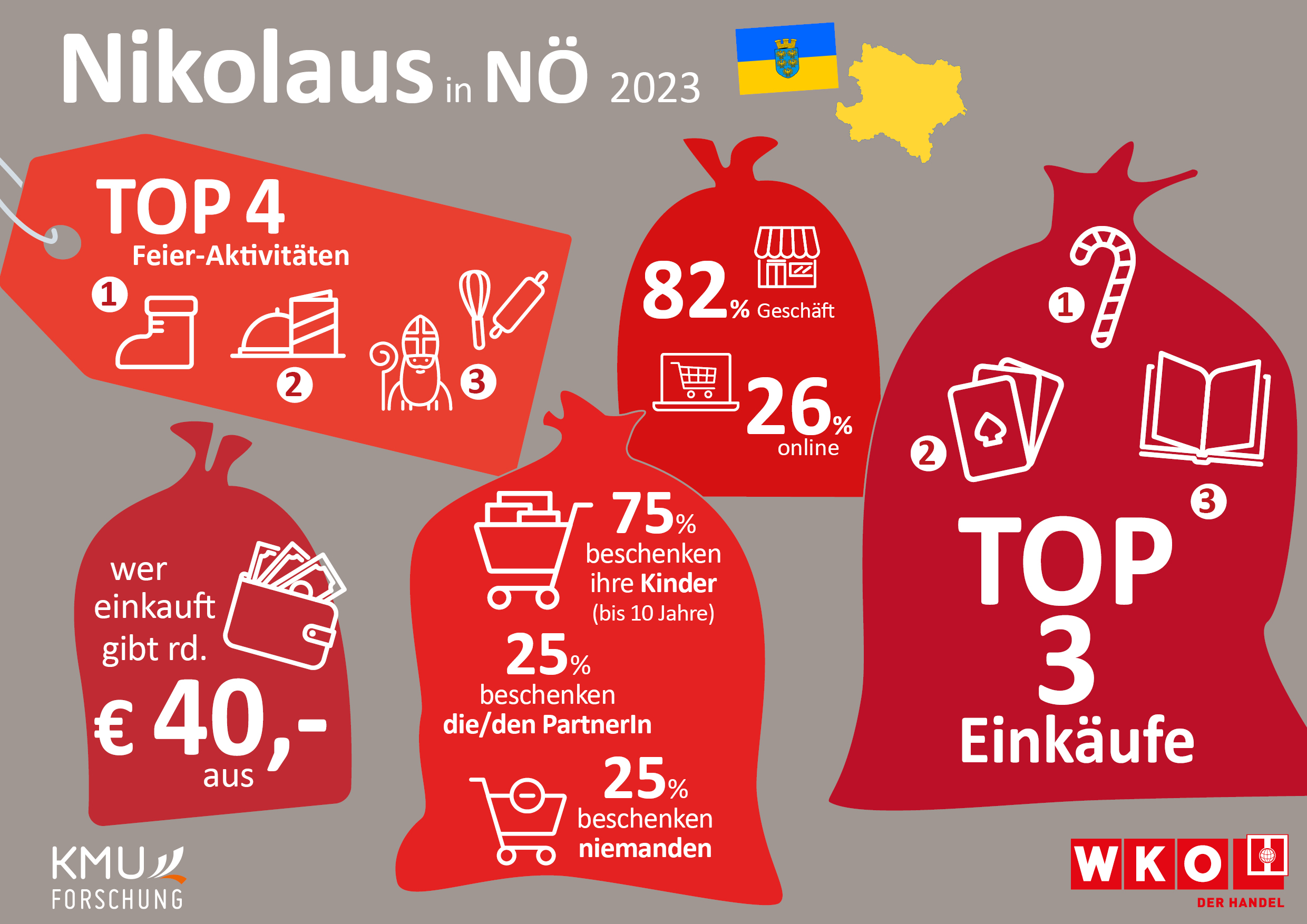 Mandarinen. Nüsse. Schoko-Nikoläuse, aber auch Spielsachen und Geschenke: Der Gedenktag des Heiligen Nikolaus am 6. Dezember wird im gesamten Christentum begangen und ist mit zahlreichen Bräuchen verbunden. Auch in Niederösterreich nehmen viele Menschen diesen Tag zum Anlass, um ihre Lieben zu beschenken. „Für viele Niederösterreicherinnen und Niederösterreicher ist das Nikolausfest ein wichtiger Kaufanlass und für den heimischen Handel eine gute Umsatzmöglichkeit“, erklärt Franz Kirnbauer, Obmann der Sparte Handel in der Wirtschaftskammer NÖ. Aktuelle Zahlen der KMU Forschung Austria zeigen, dass dabei Kinder unter zehn Jahren in 75 Prozent der Fälle von ihren Eltern beschenkt werden. Darüber hinaus geben 25 Prozent der Befragten an, ihren Partnern ein Präsent zu übergeben.