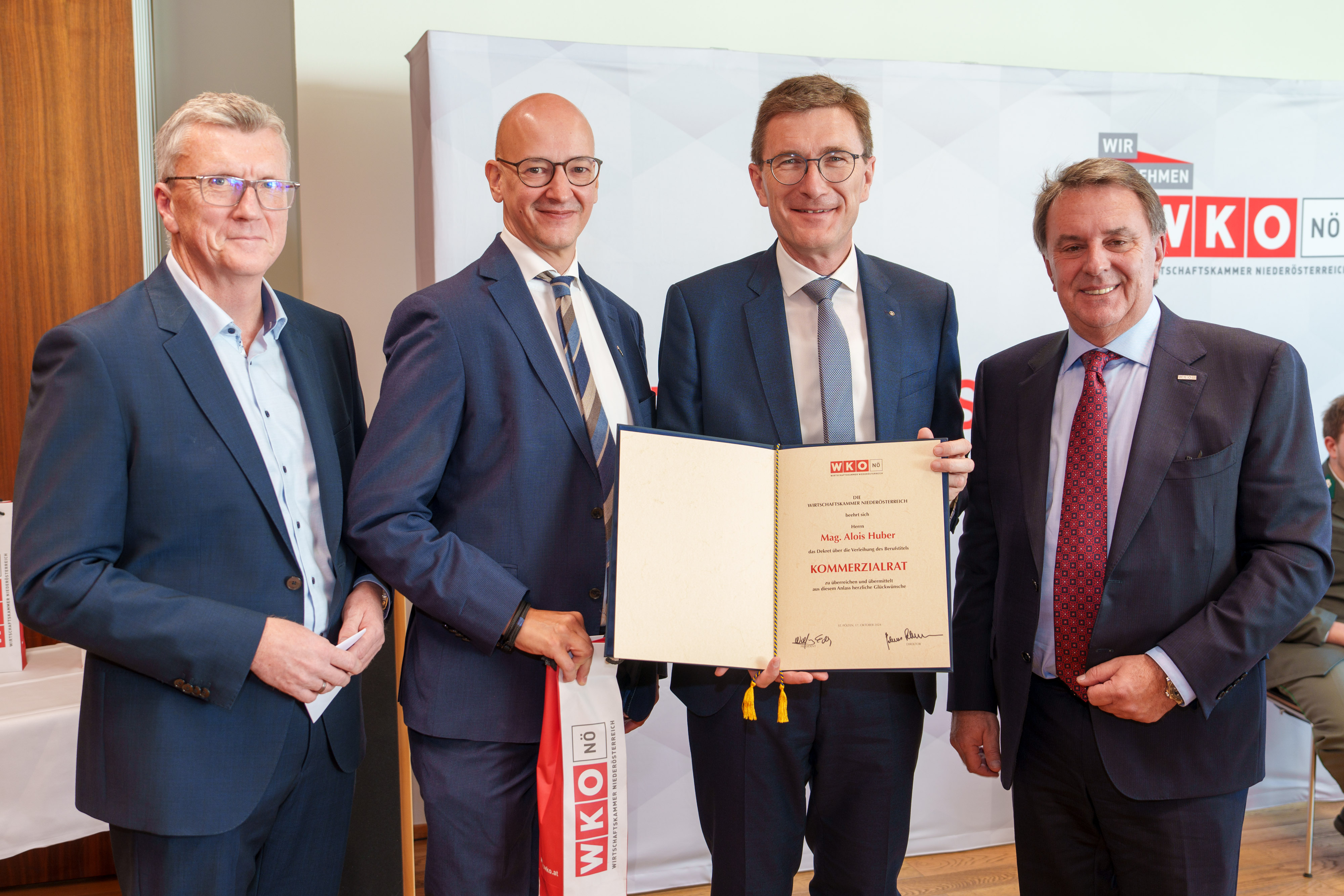 WKNÖ-Präsident Wolfgang Ecker überreichte im Rahmen eines Festaktes im Schwaighof (St. Pölten) das Dekret über die Verleihung des Berufstitels ‚Kommerzialrat‘ an Alois Huber. Damit erfahren die Leistungen des verdienten Vertreters der Wirtschaft eine offizielle Anerkennung durch die Republik Österreich. Grundlage dafür ist die Entschließung von Bundespräsident Alexander Van der Bellen. Alois Huber ist nun berechtigt, den Berufstitel Kommerzialrat zu führen.